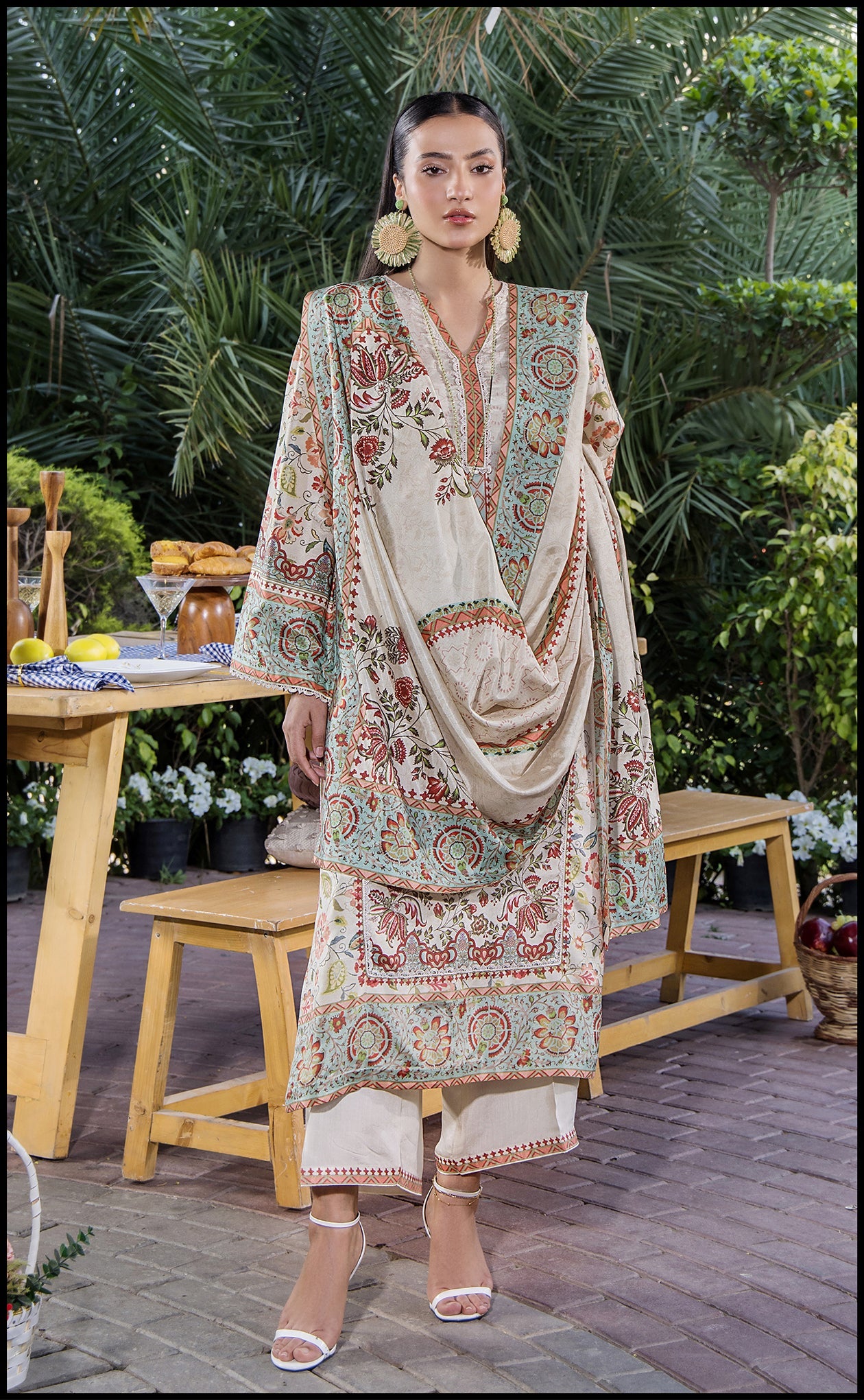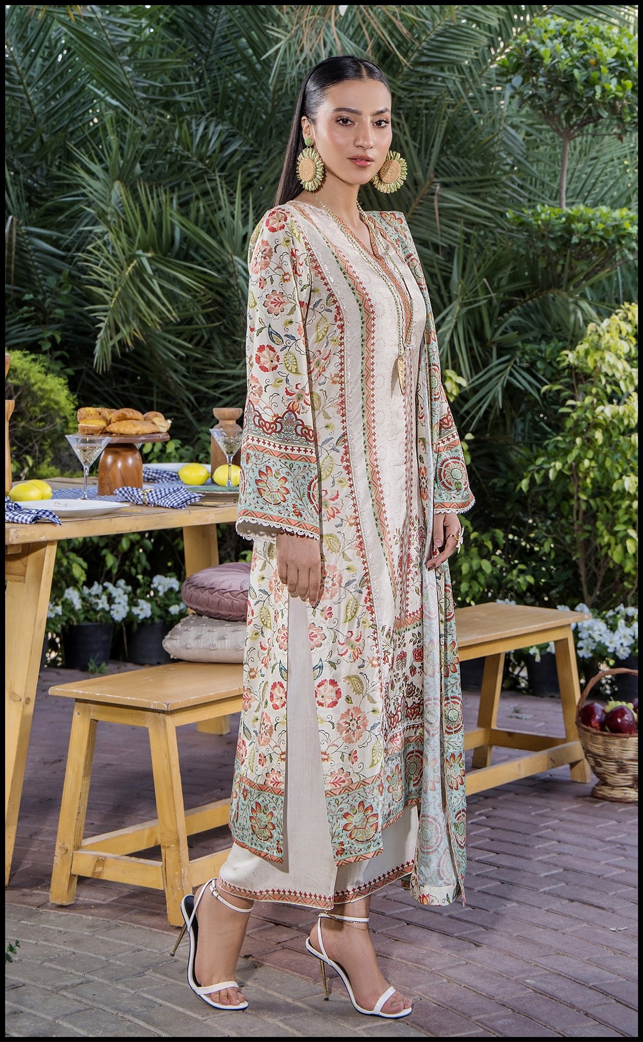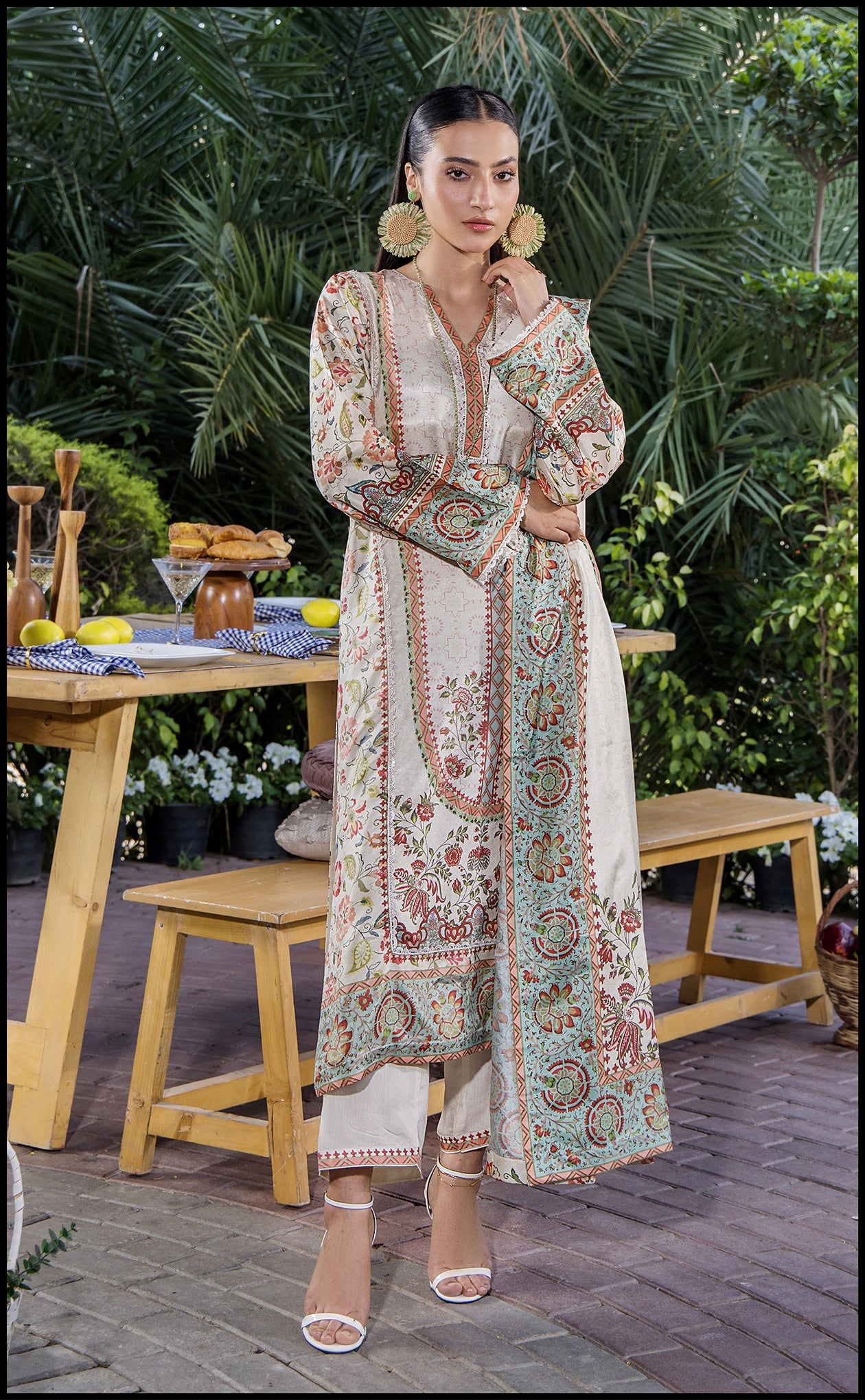 This elegant 3-piece ensemble is crafted from premium raw silk fabric, featuring a long kurta adorned with delicately printed traditional patterns in soft shades of red, green, and beige. Complemented by matching trousers and a richly bordered dupatta, this outfit exudes timeless grace—perfect for garden gatherings or festive luncheons. The luxurious texture and detailed artistry make it a standout choice for refined daytime occasions.