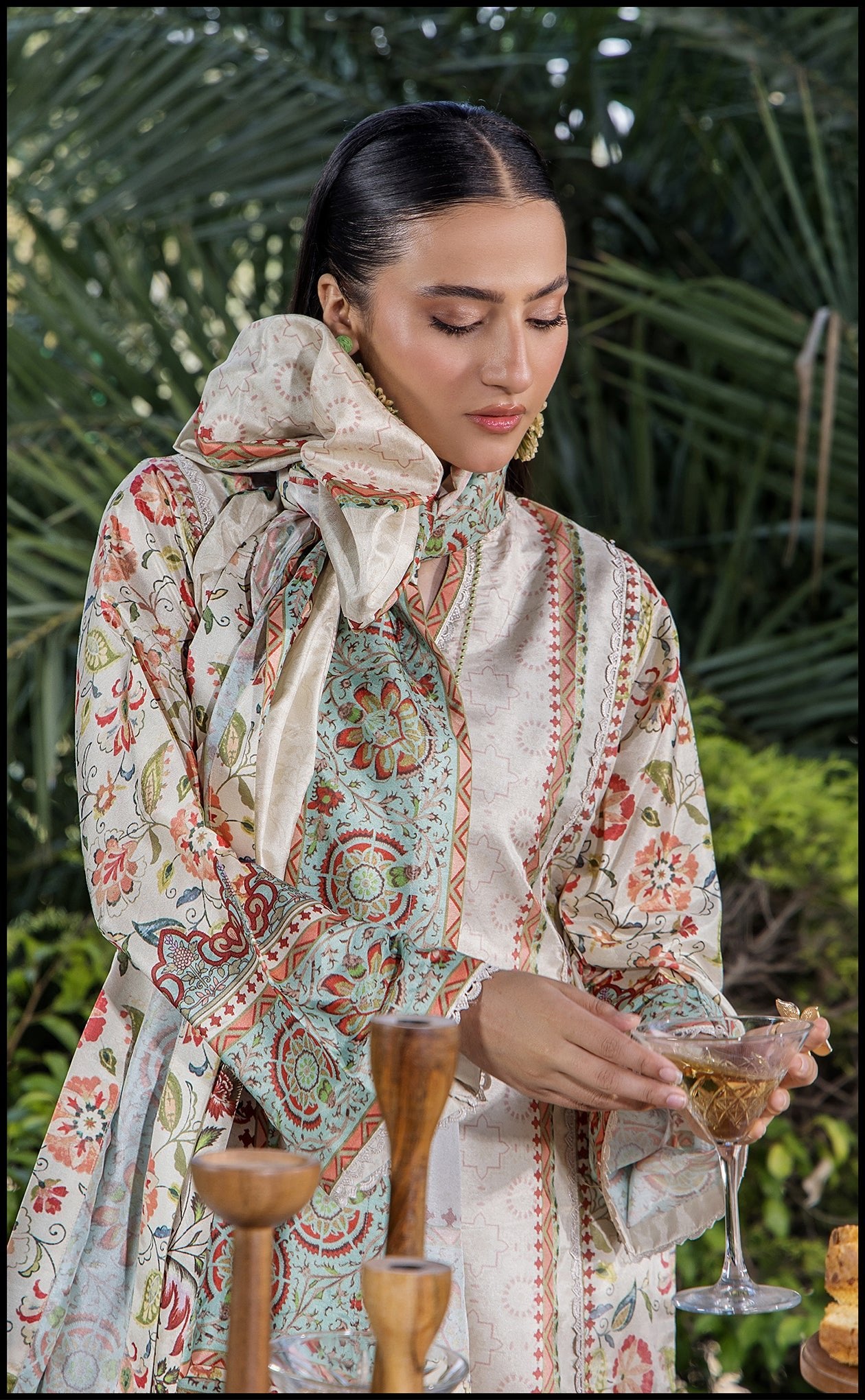 A storybook of florals and ethnic motifs on ivory rawsilk, finished with intricate borders for a dreamy daytime look.