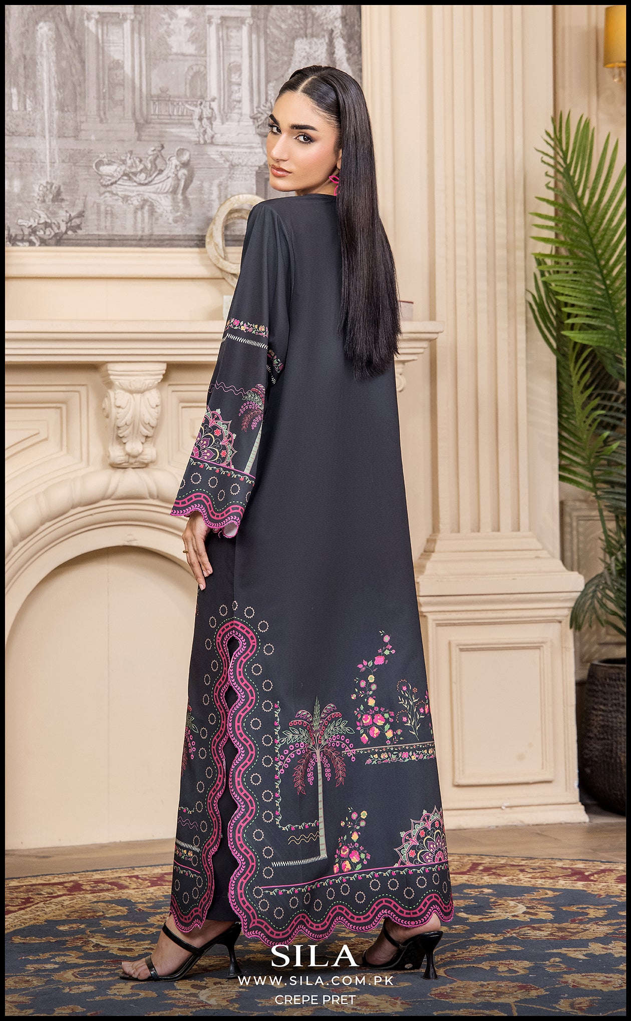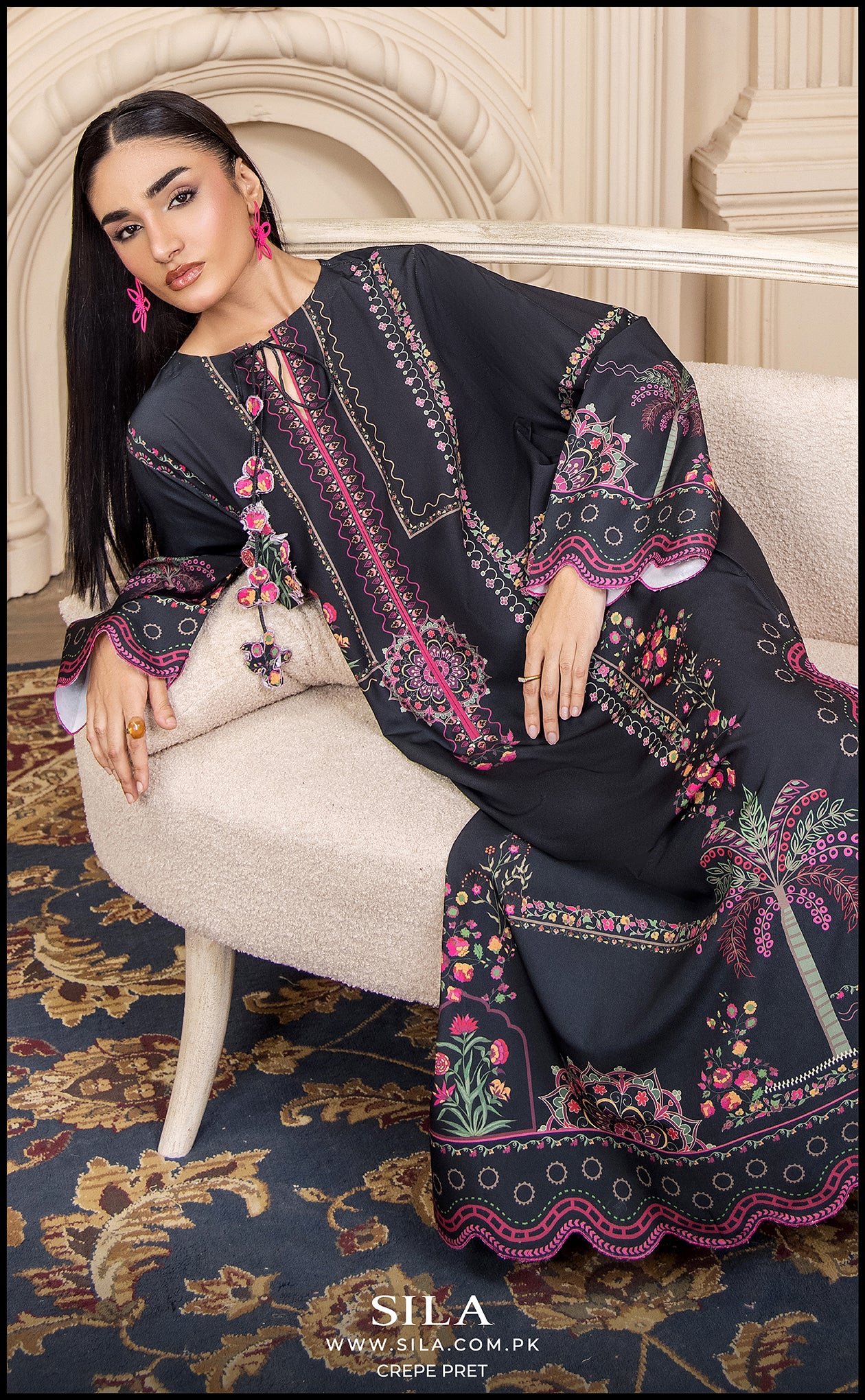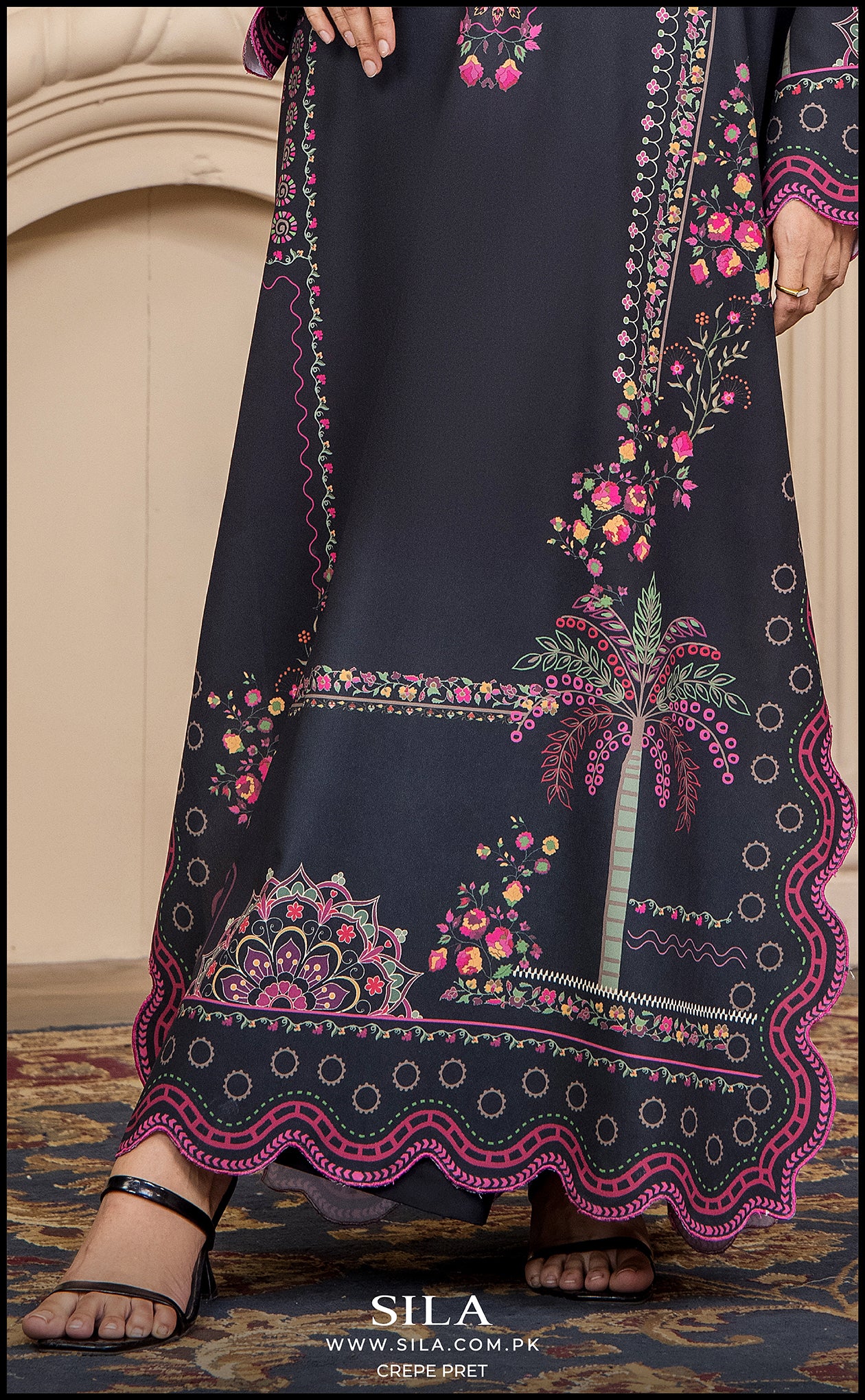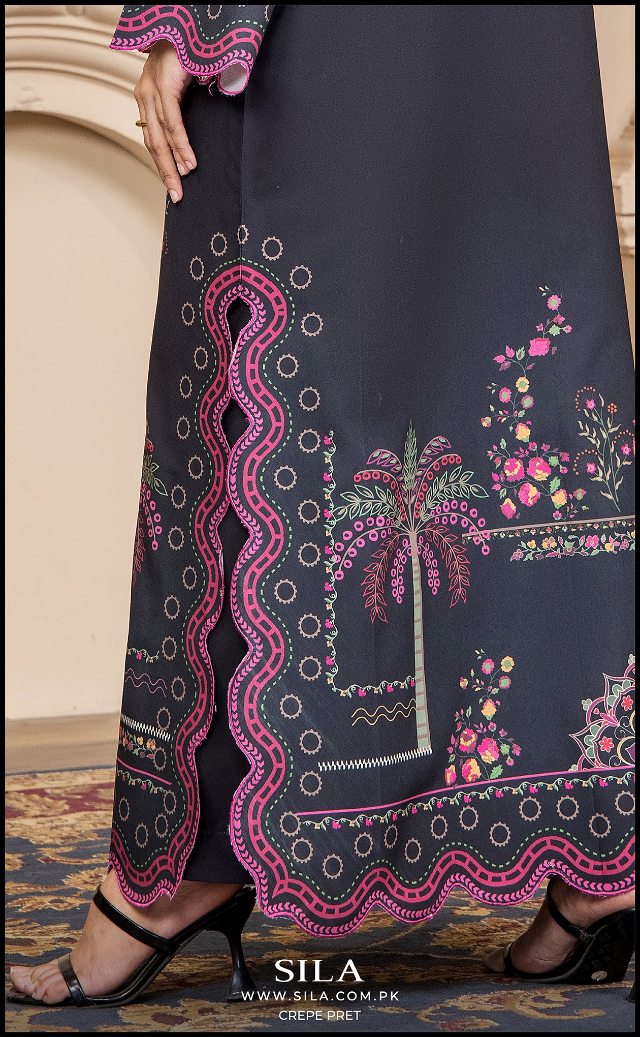 This striking 2-piece ensemble is made from a luxurious, flowing material. The full-length shirt features an exquisite digital print in a deep noir shade. The design is beautifully accented with intricate, embroidery-style patterns in vibrant shades of hot pink, olive green, and gold, highlighting the neckline, sleeves, and extended hemline. The border finishes with delicate scalloping. This ready-to-wear article includes a matching bottom and is an ideal choice for a sophisticated, comfortable, and memorable look for any semi-formal or festive event. ✨