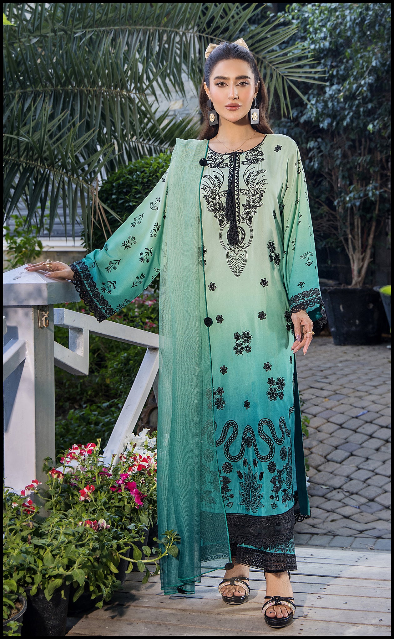 Let your presence bloom in "Emerald Mirage," a serene blend of mint and sea green tones with intricate black embroidery reminiscent of enchanted gardens. Crafted in breathable PP lawn for all-day comfort, the shirt features graceful detailing and embroidery at the neckline and hem. Paired with a flowy cotton net dupatta, it evokes freshness and poise – perfect for elevated daywear.