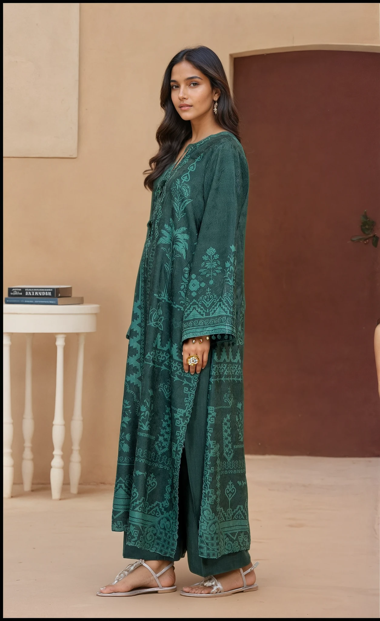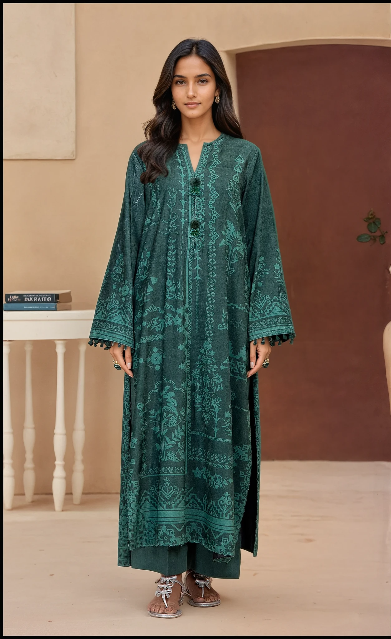 A vibrant and sophisticated ensemble showcasing a long shirt in a striking emerald-green printed velvet fabric. The shirt features an eye-catching geometric and floral print, accented by subtle tassel details at the neckline and cuffs, paired with coordinating viscose trousers.