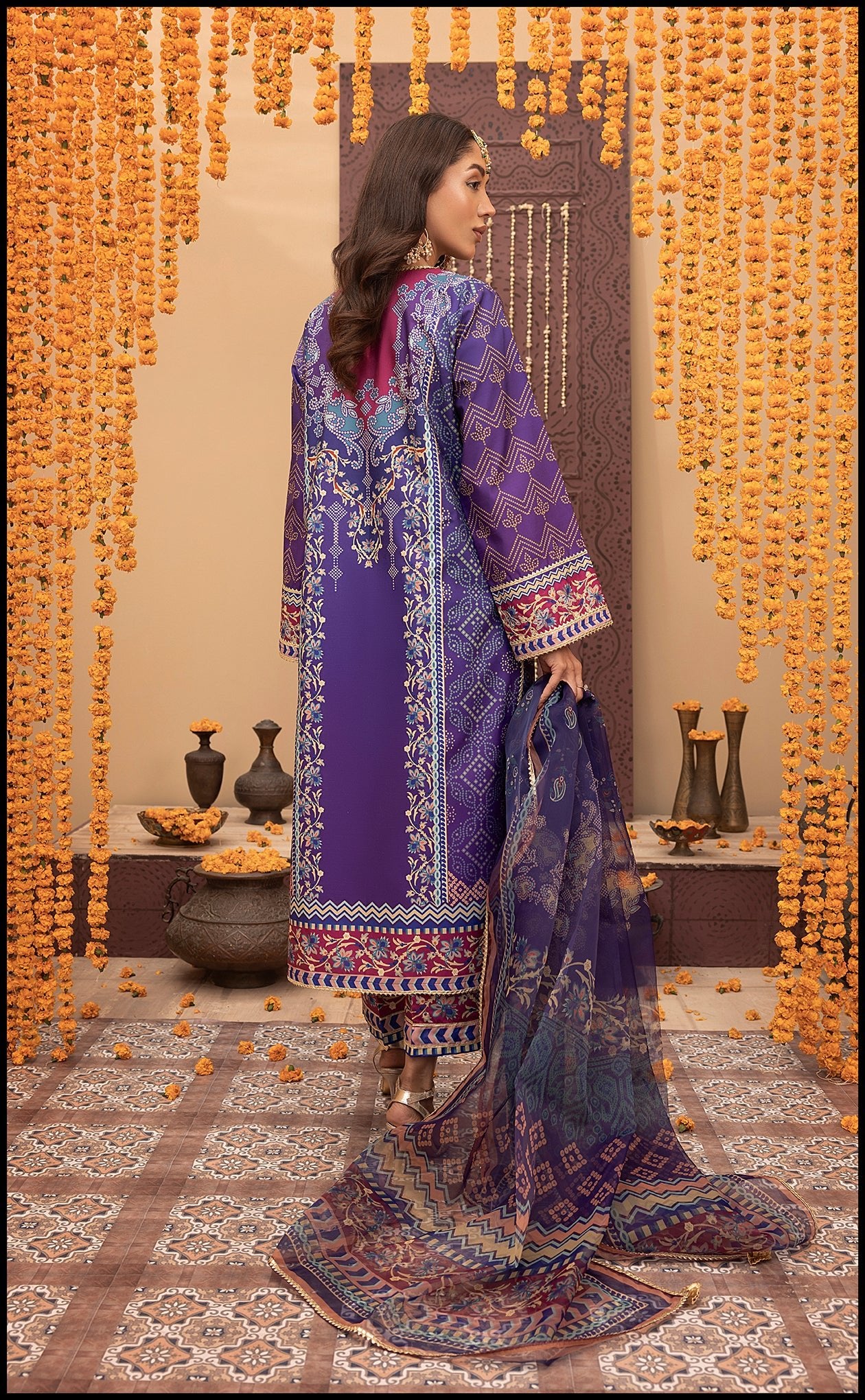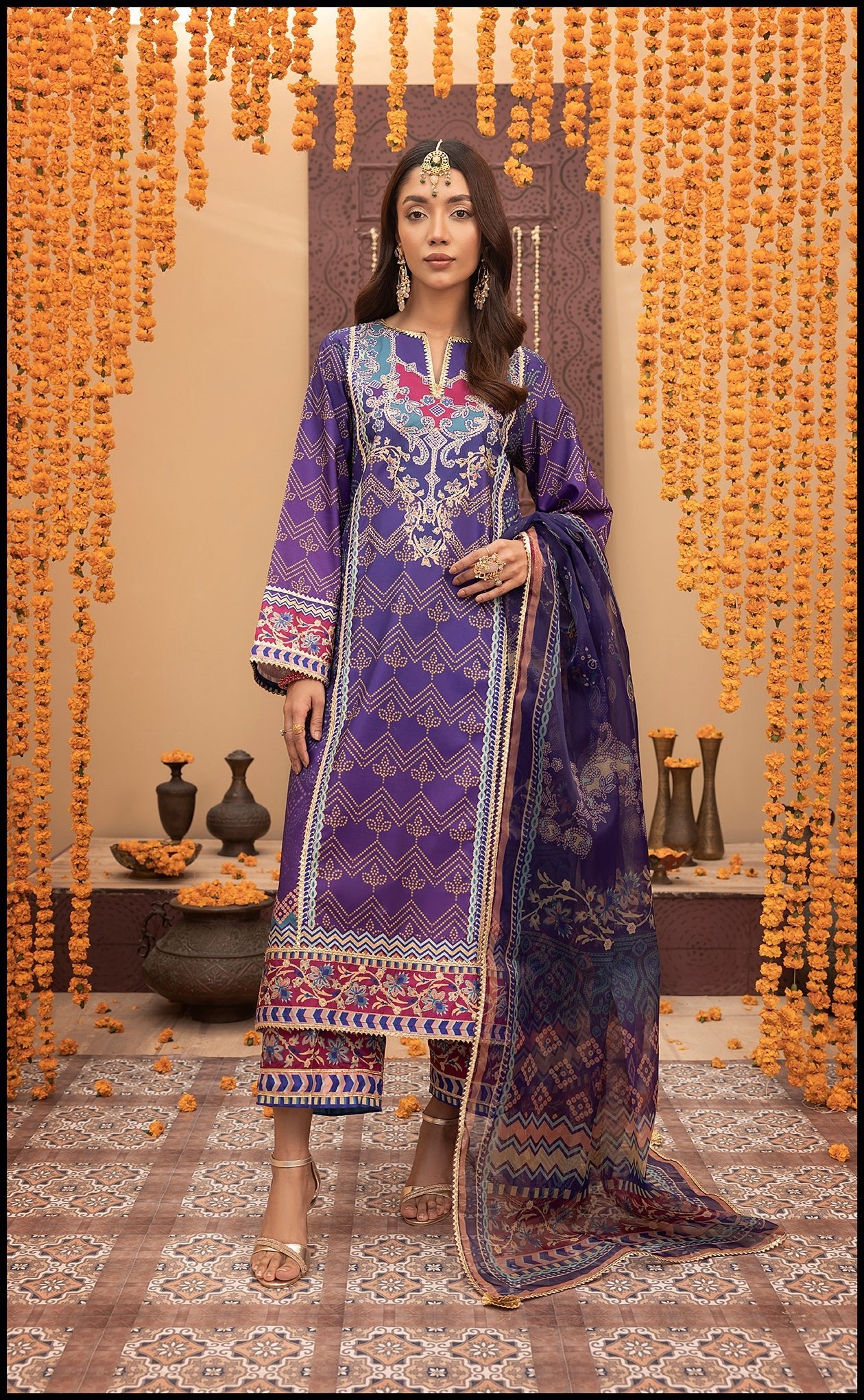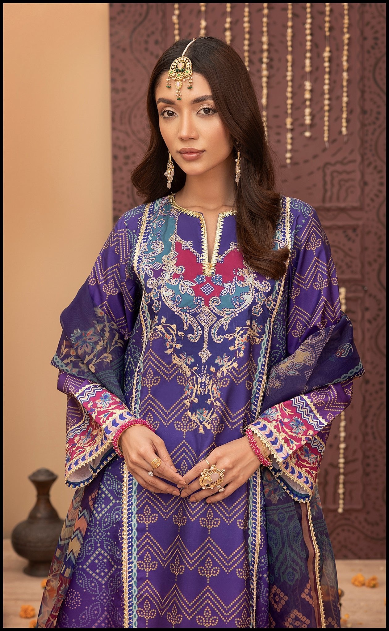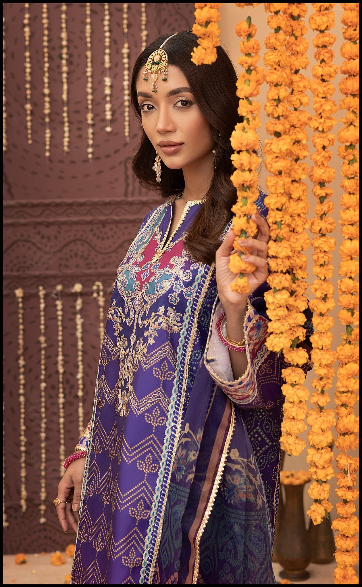 A captivating 3-piece raw silk ensemble that exudes sophistication and poise. The deep violet canvas is adorned with intricate geometric and floral digital print in rich shades of gold, pink, and teal, creating a mesmerizing contrast. Complemented by an elegantly designed add-on dupatta, featuring delicate patterns and ornate borders, this ensemble is perfect for those who seek timeless grace and festive charm.