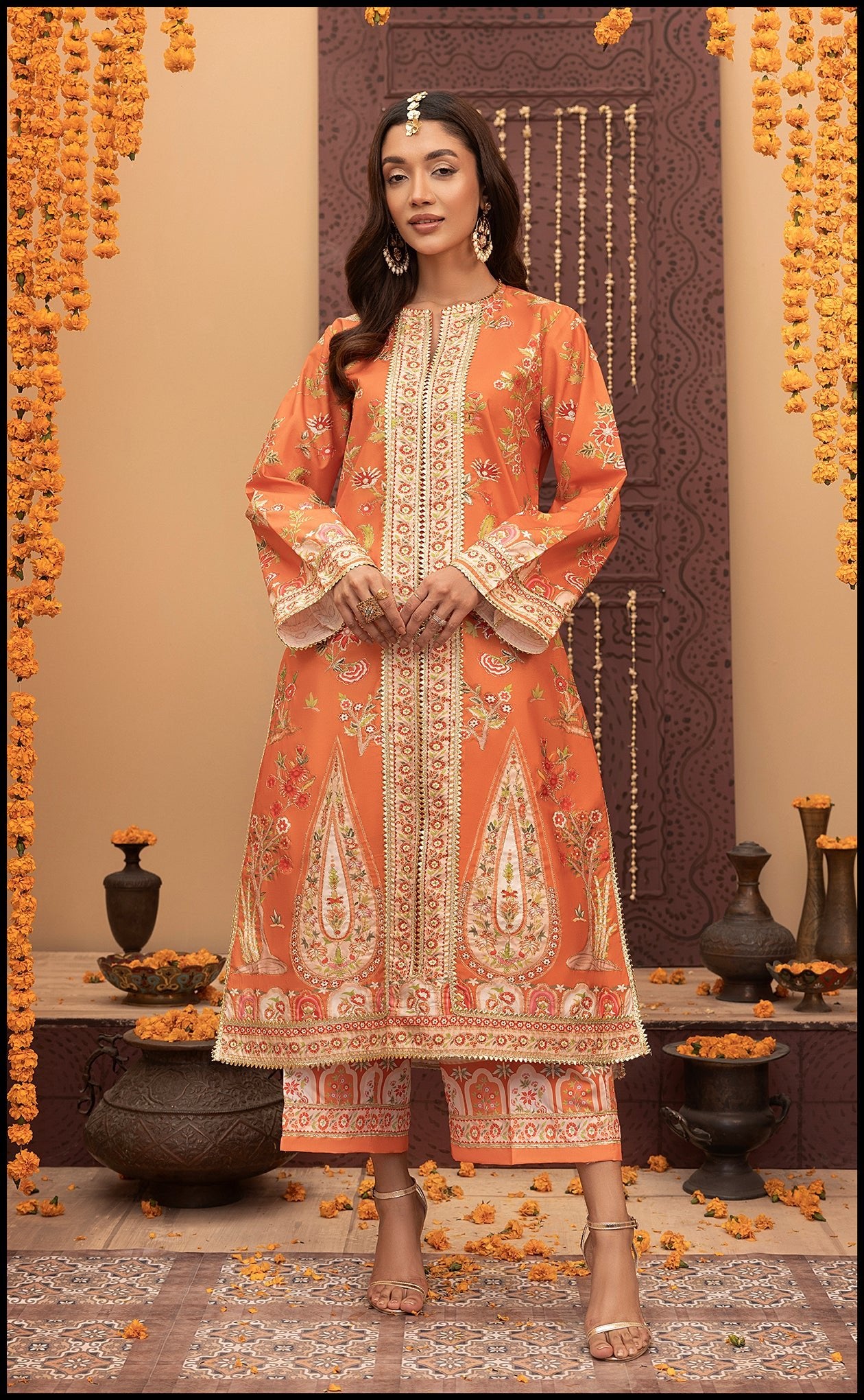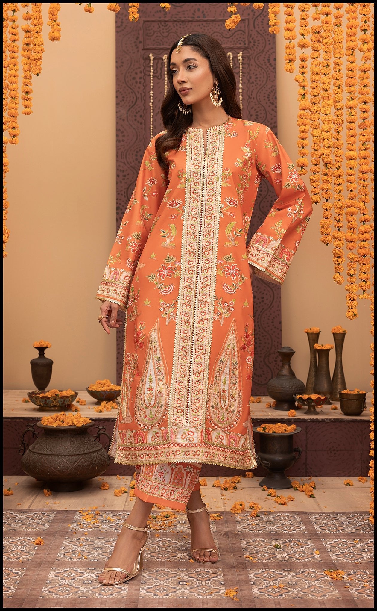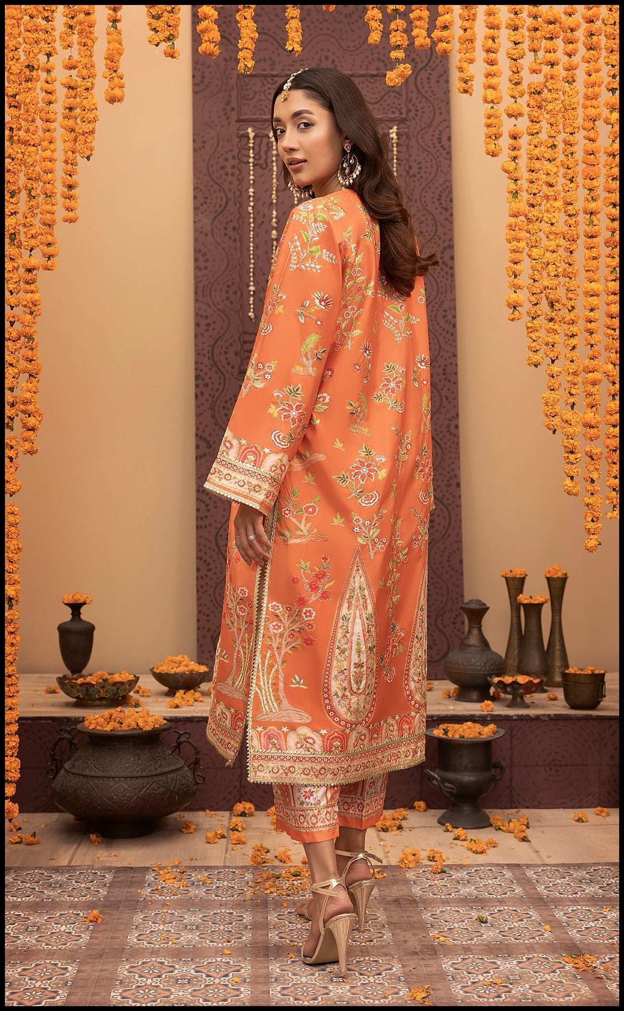 An exquisite 3-piece raw silk ensemble that radiates vibrant elegance. The warm orange canvas is adorned with intricate floral embroidery in shades of gold, green, and ivory, creating a rich and graceful design. Paired with a beautifully crafted add-on dupatta, featuring delicate patterns and ornate borders, this ensemble is the perfect choice for festive occasions, offering an unmatched blend of charm and sophistication.