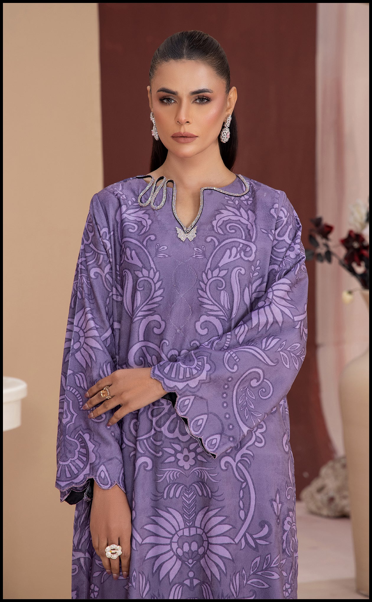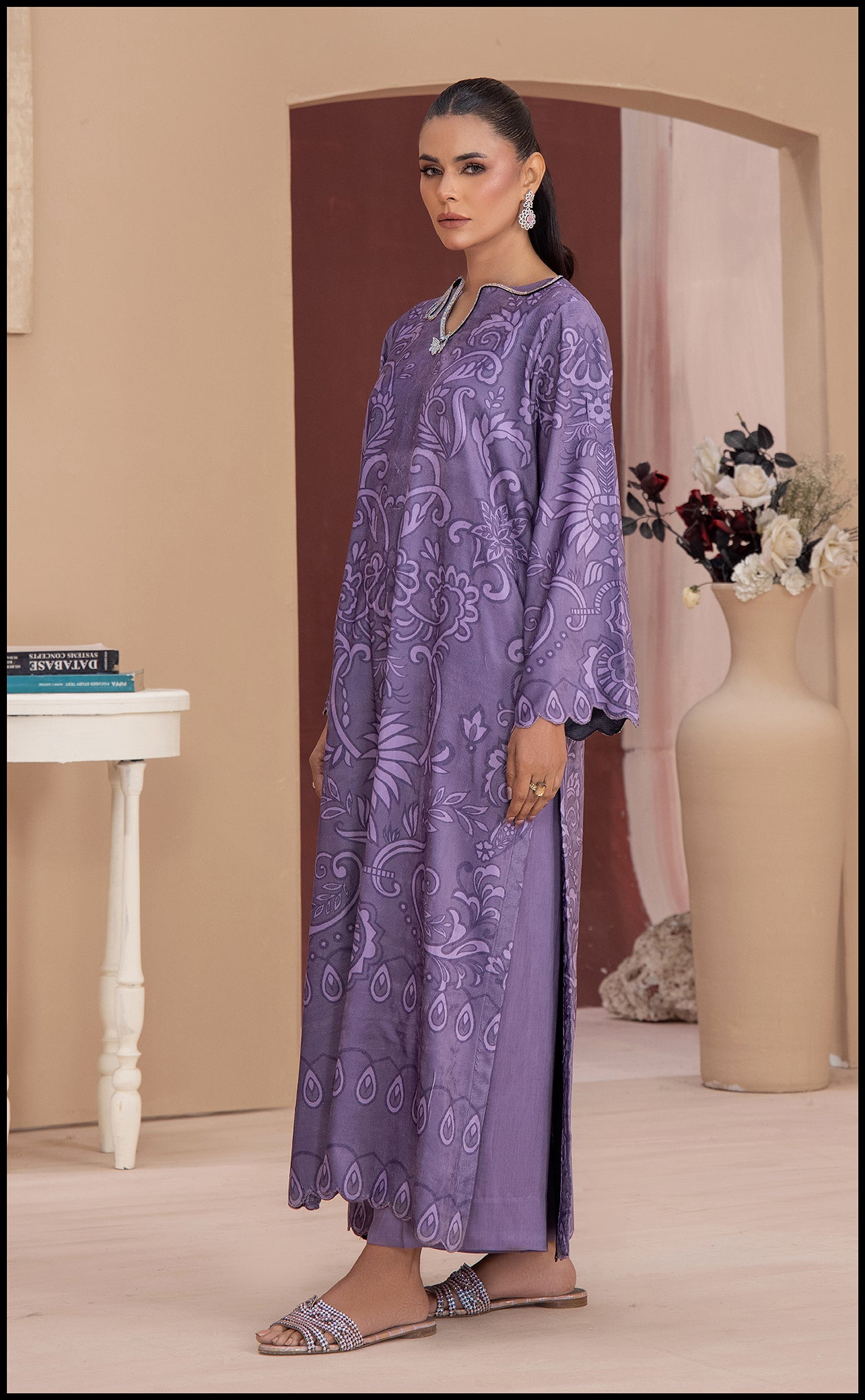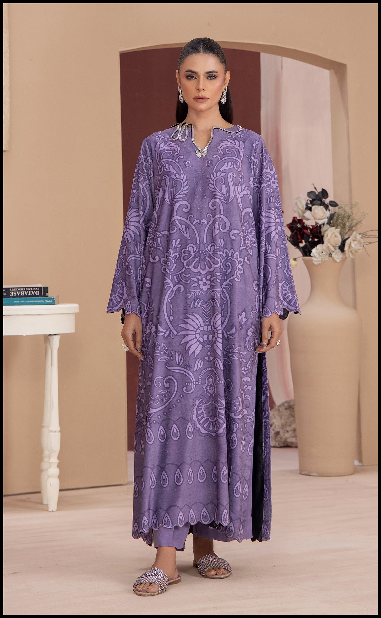 A sophisticated and serene suit featuring a long, straight kurta crafted from beautiful printed velvet in a soft lavender or mauve shade. The tonal, all-over floral print gives it depth, complemented by a delicate, jeweled neckline and matching viscose trousers.