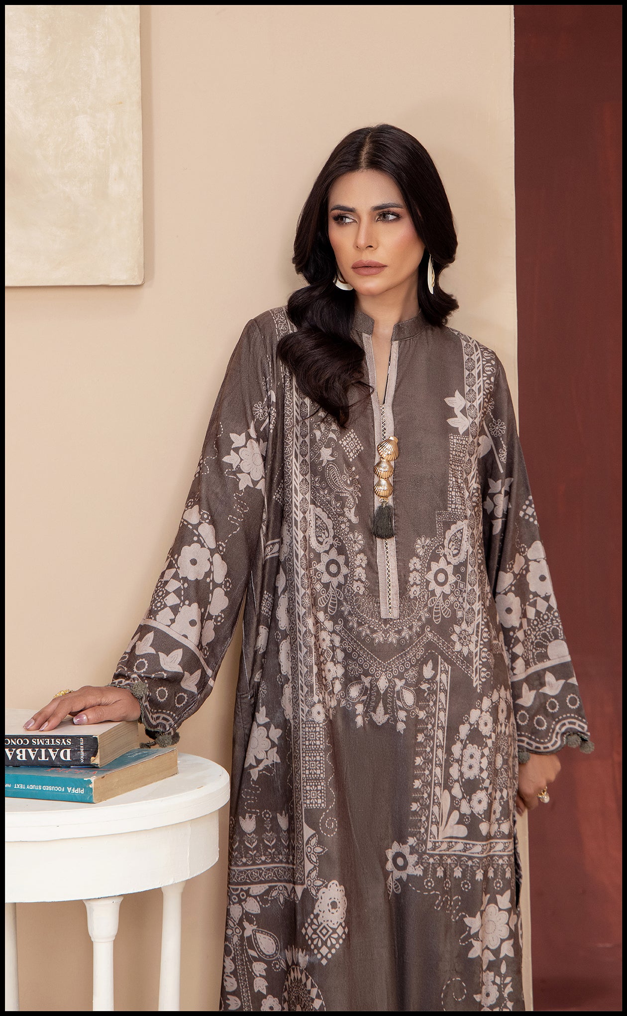 A sophisticated look showcasing a straight long kurta crafted from rich brown/taupe printed velvet. The contrasting, lighter-hued floral and motif print is balanced by a simple tassel neckline, paired with comfortable, coordinating viscose trousers.