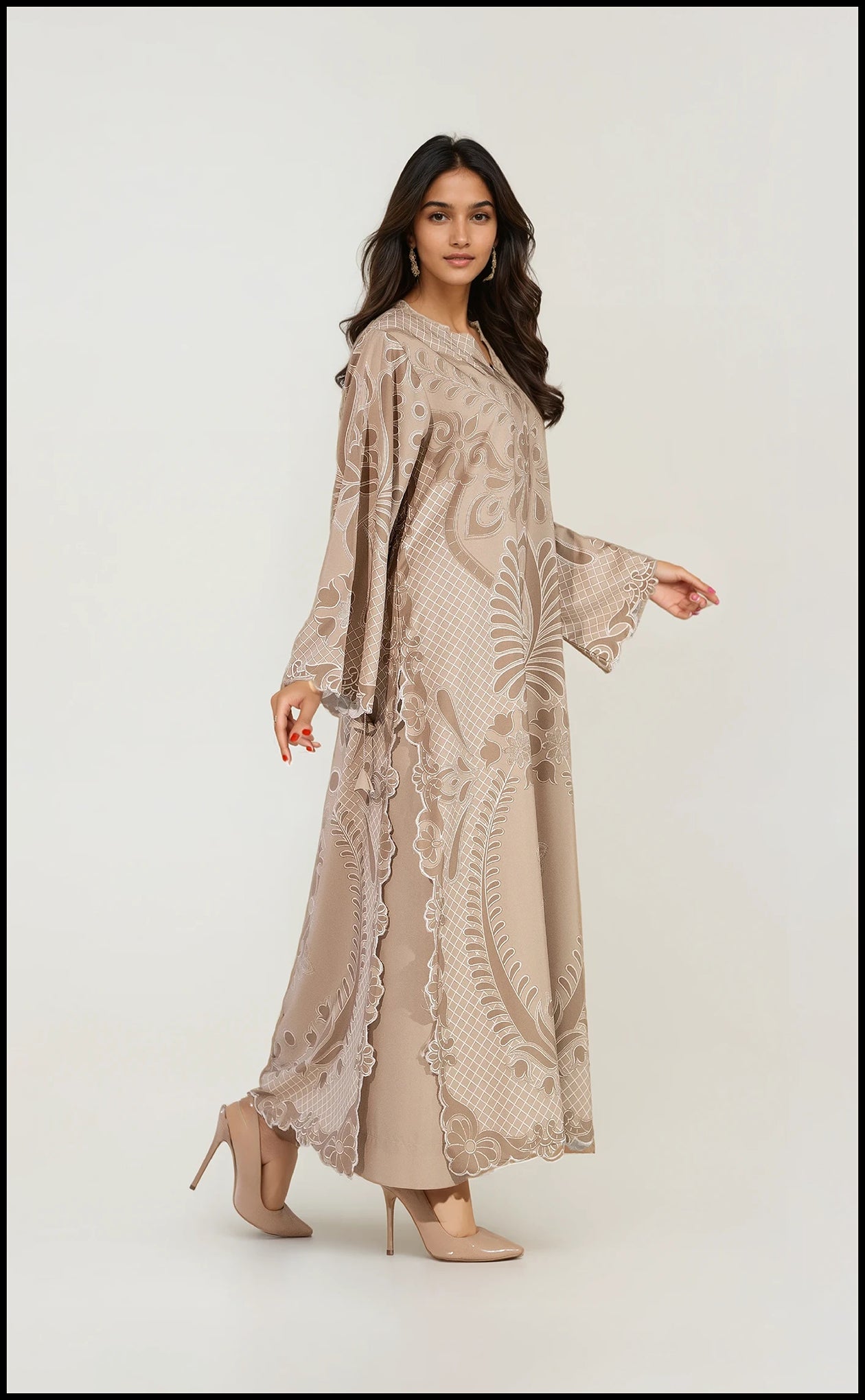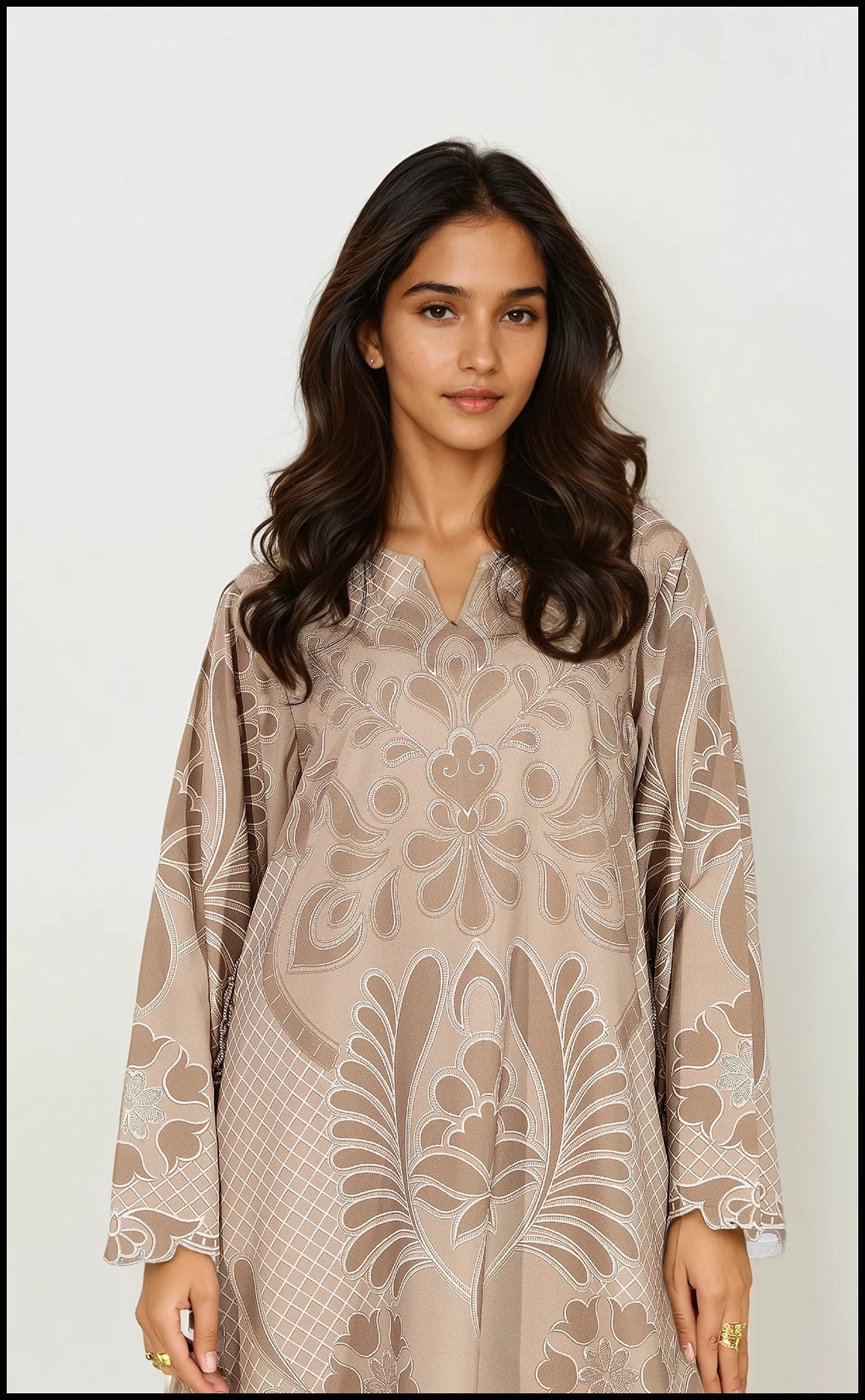 Wrap yourself in the rich warmth of the SILA: Dune Tapestry. This beautiful two-piece is crafted from cozy winter slub fabric in an earthy taupe hue, showcasing a grand, all-over pattern that evokes an antique woven tapestry. The sophisticated look is refined with delicate scalloped edges at the cuffs and neckline, offering a blend of comfort, majestic style, and subtle decorative detail for the colder months.