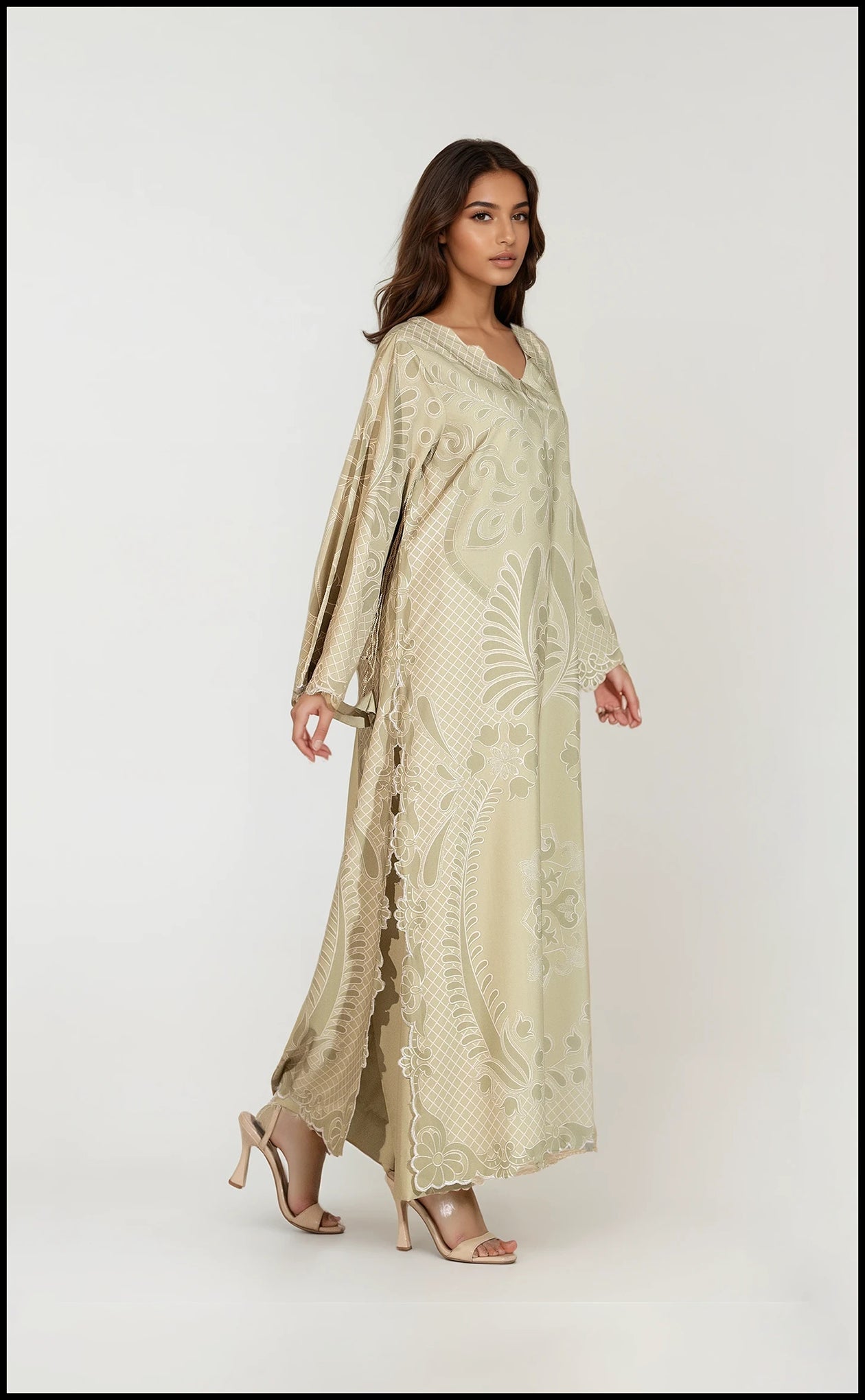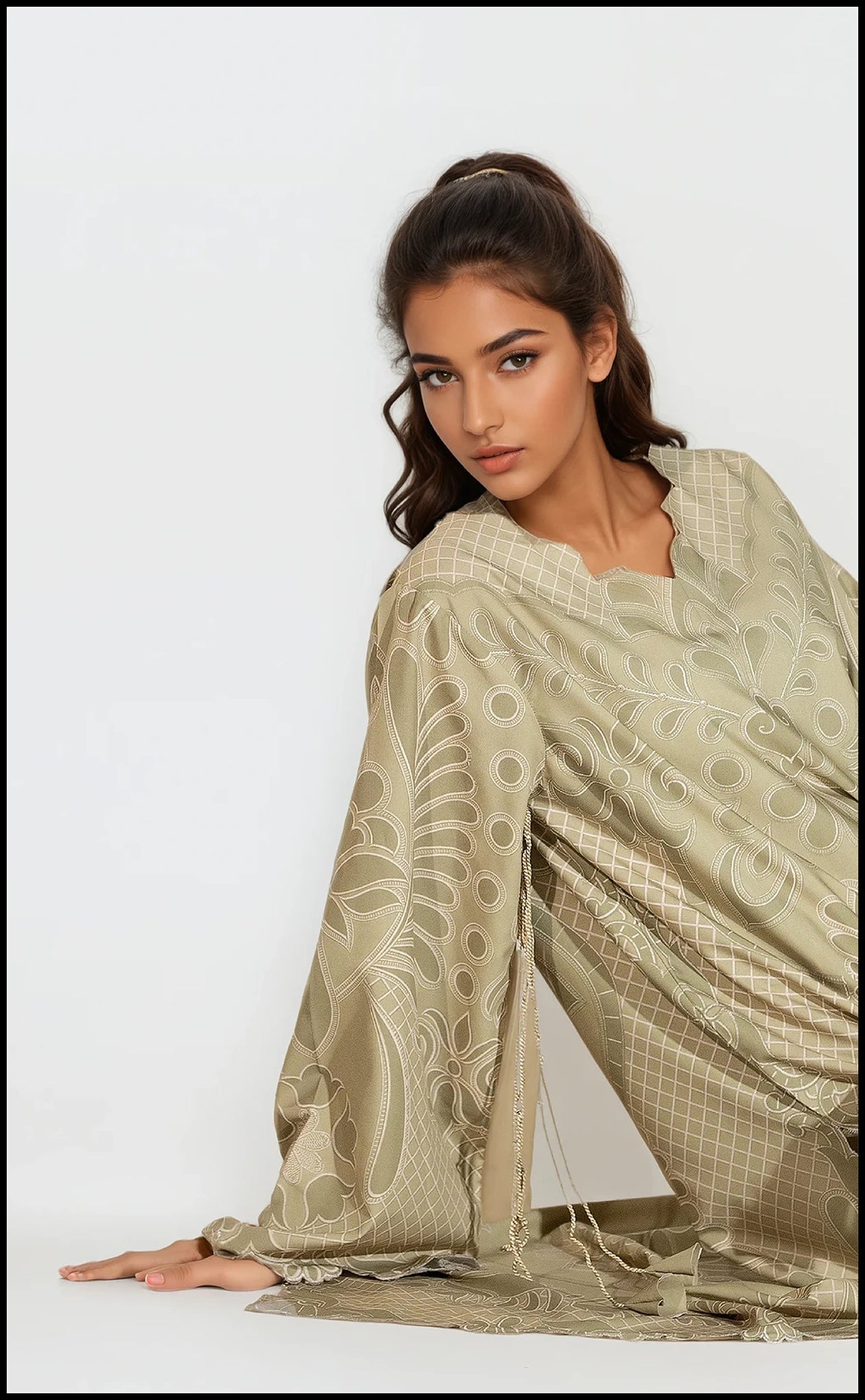 Elegance is understated with the Sage Aura Slub set. This soft, luminous two-piece features a tone-on-tone, large-scale floral and geometric print that mimics the texture of fine brocade. The delicate sage green hue and scalloped detailing at the cuff and neckline offer a refined, graceful appeal for elevated daytime wear.