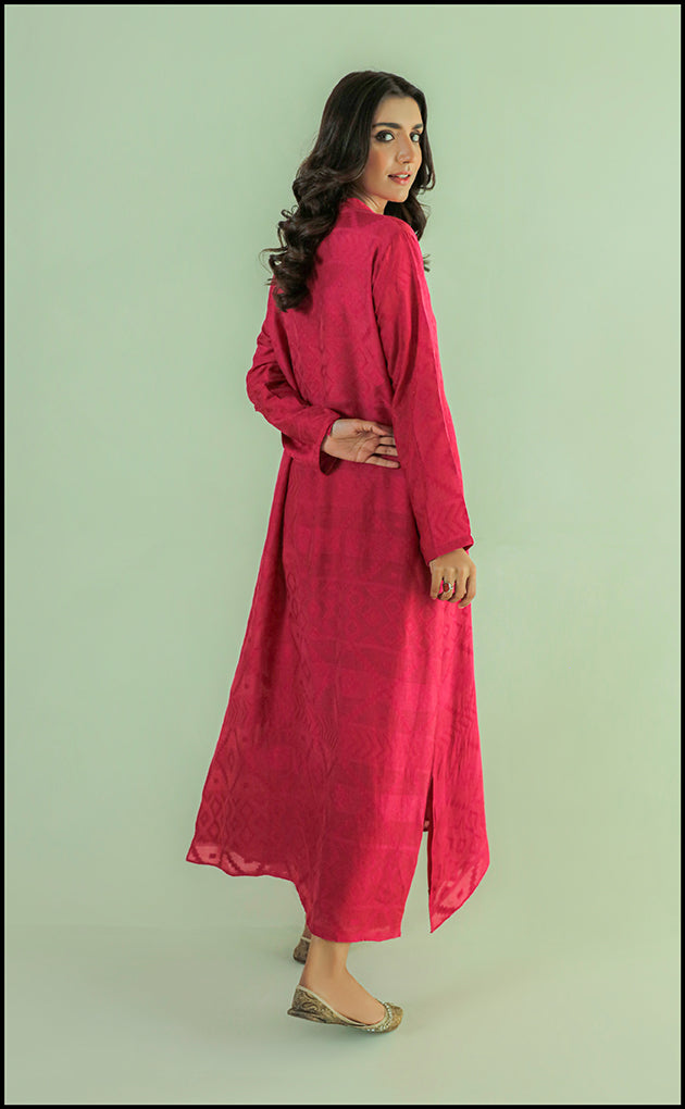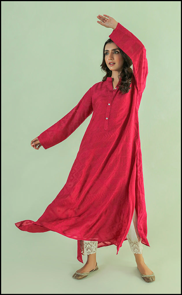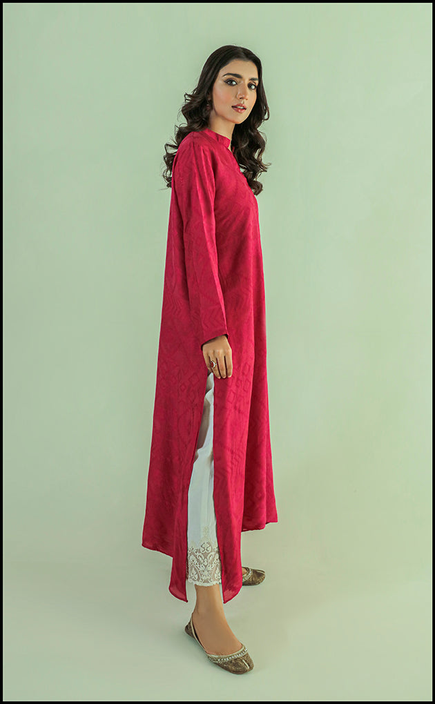 - Magnolia pink color embossed on jacquard fabric giving a very rich and chic look to your wardrobe. Embedded self-fabric draped in Aline shirt to form a sleek piece.