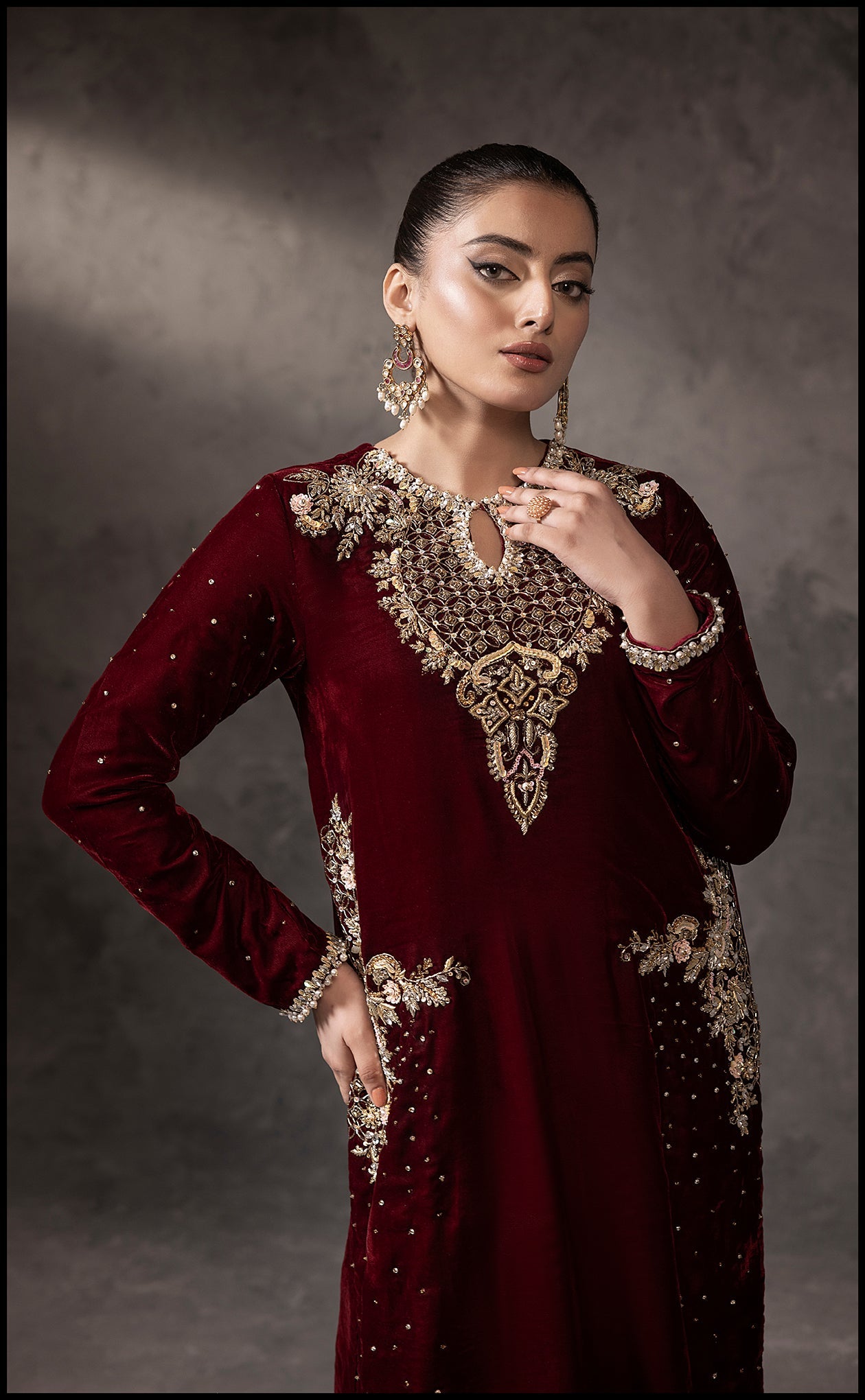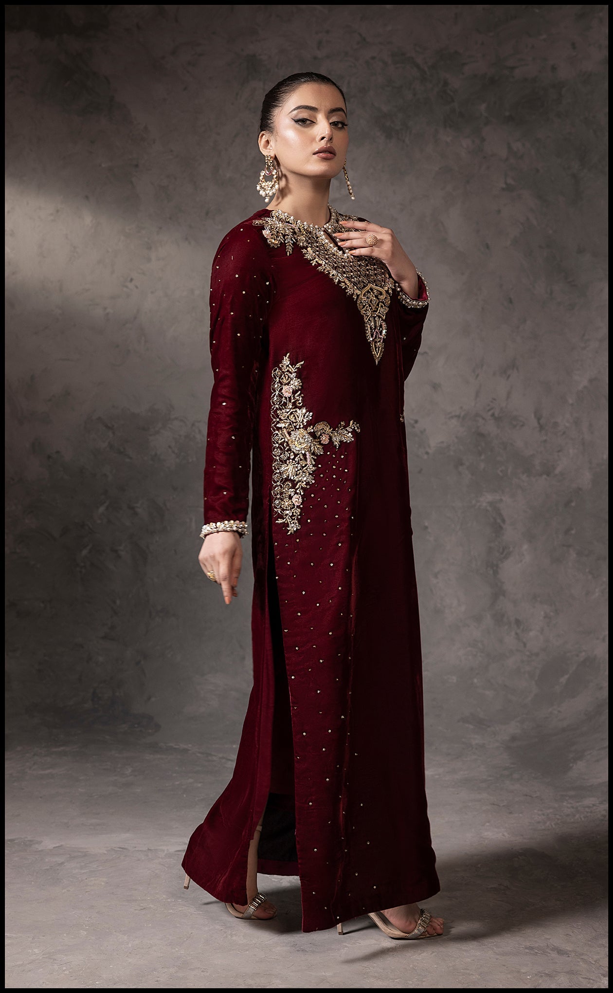 Step into sophistication with Amara, a stunning 2-piece velvet pret ensemble in a rich maroon tone. This exquisite outfit features intricate golden embroidery and delicate embellishments that exude a royal charm. Designed with a flattering high slit and impeccable detailing, it's perfect for festive evenings or special gatherings. Let Amara be your go-to choice for a look that radiates elegance and grace.