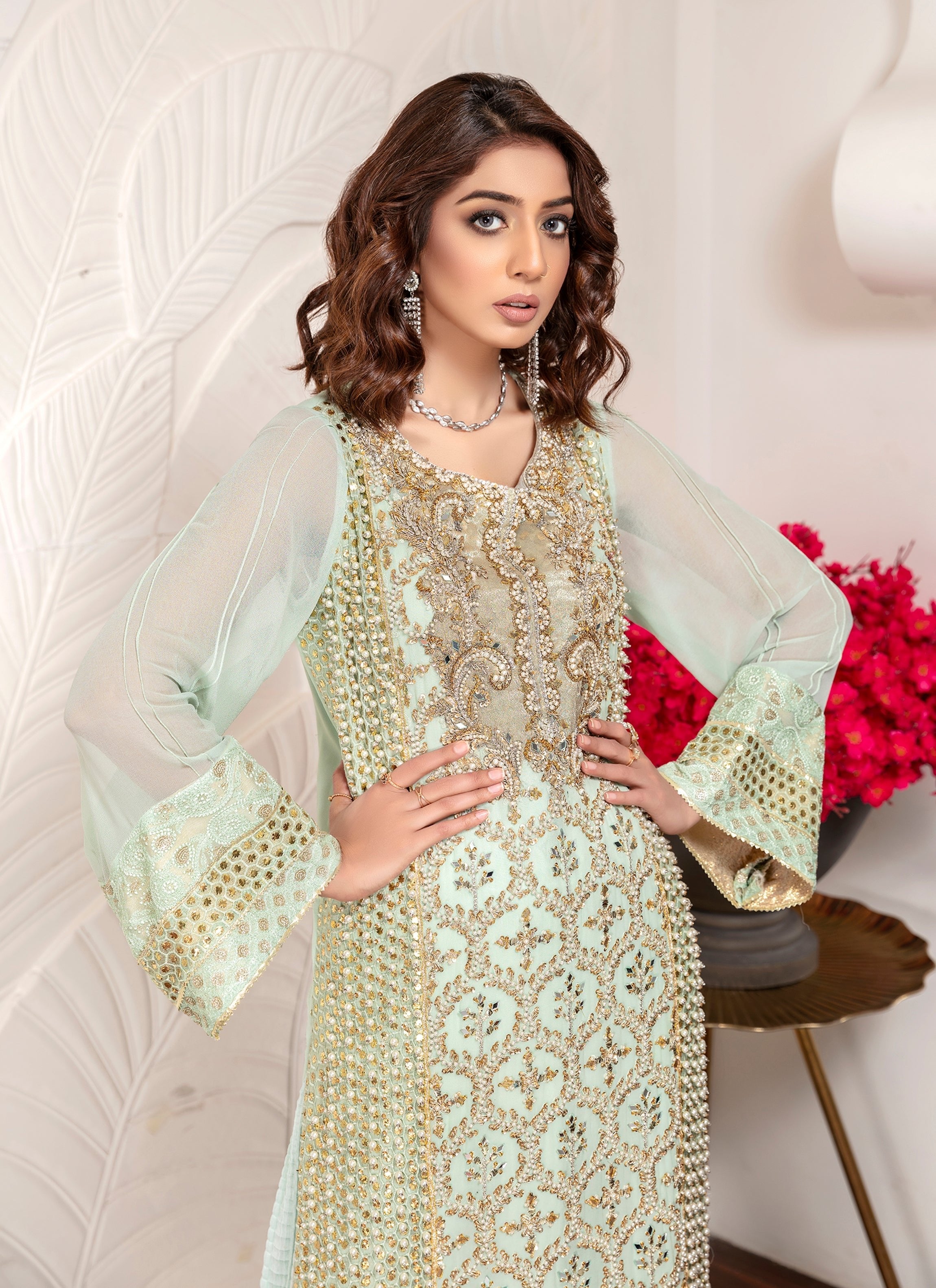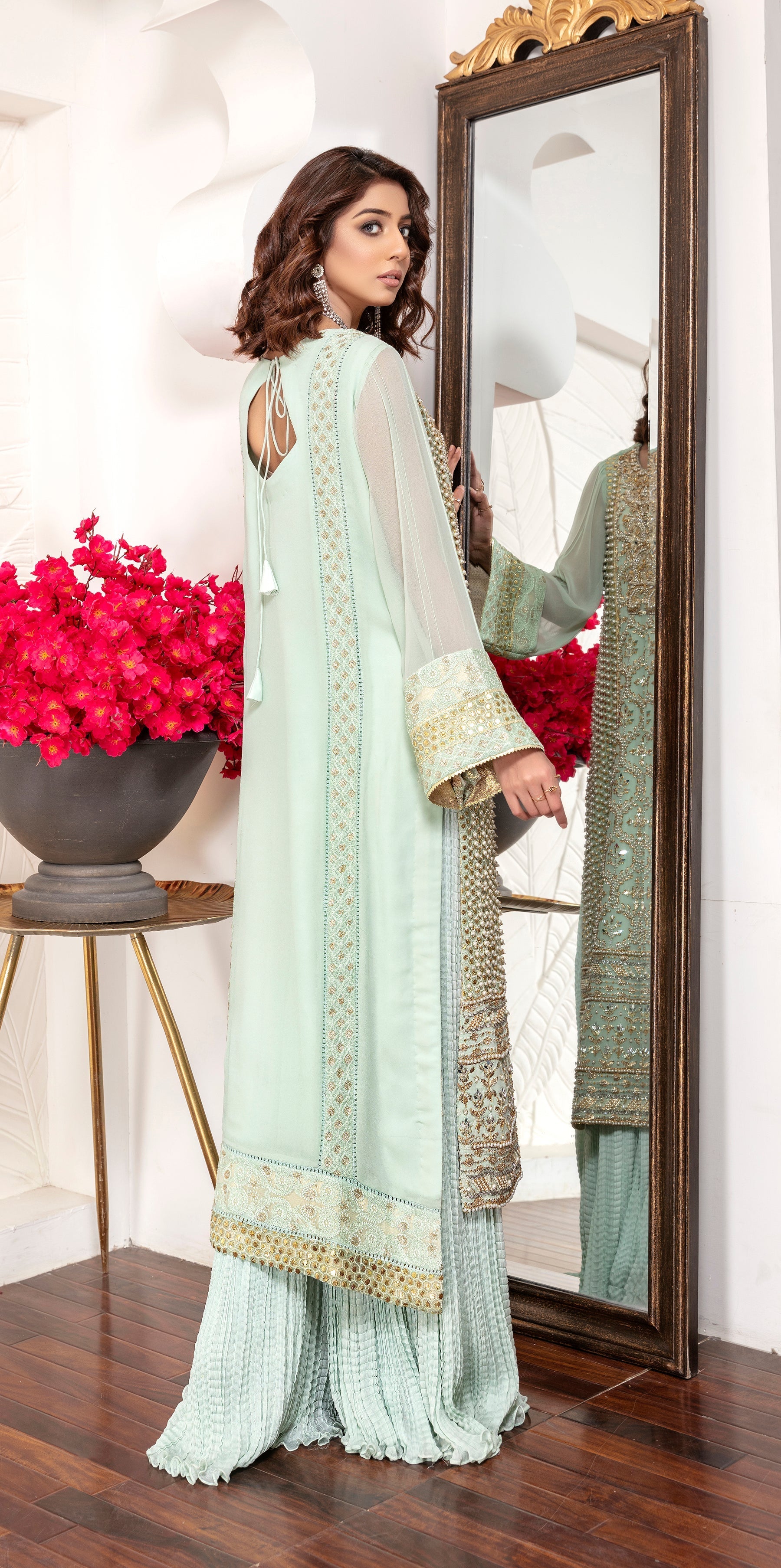 Aqua shirt higlighted with muqesh work on the side pannels which is giving a brilliance look to the color and fabric paired with crushed silk sharara