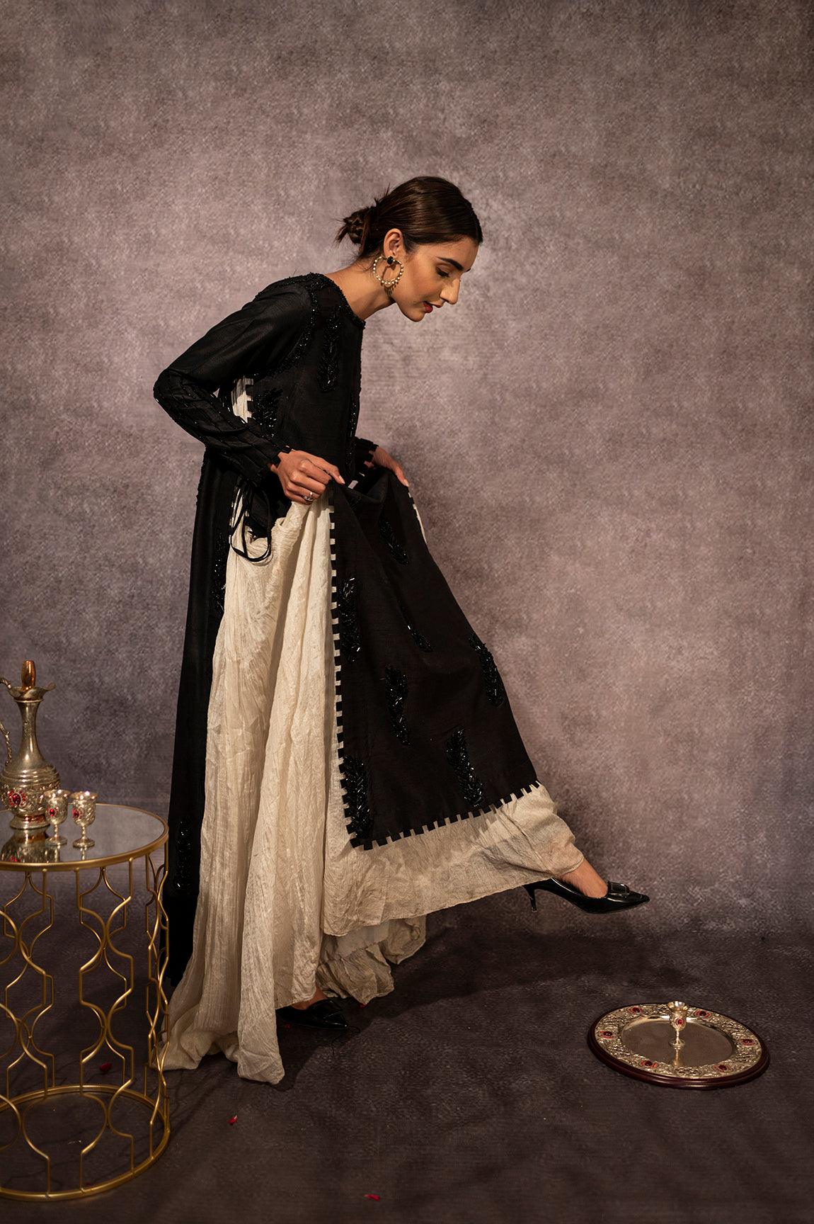 This side slit dress is a timelessly elegant piece. Comprising of a solid black hand worked raw silk shirt attached to an ivory crushed silk lining, draping weightlessly on the floor. All to ensure nothing less than a dreamy look.