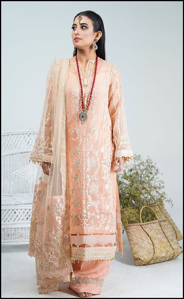 Peach affairs it well with the offwhite tones on the organza crepe fabric shirt where its slightly high lighted with the beige and skin tones of sequence. It is paired with heavy embeoidered dupatta and silk trouser defines the perfect combination for your wardrobe.