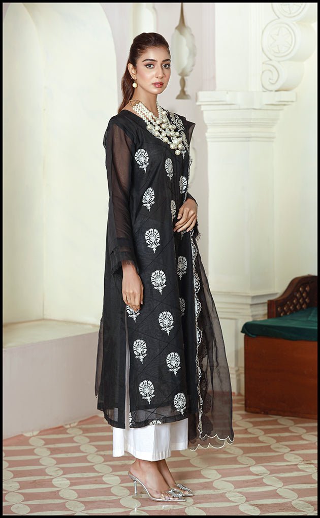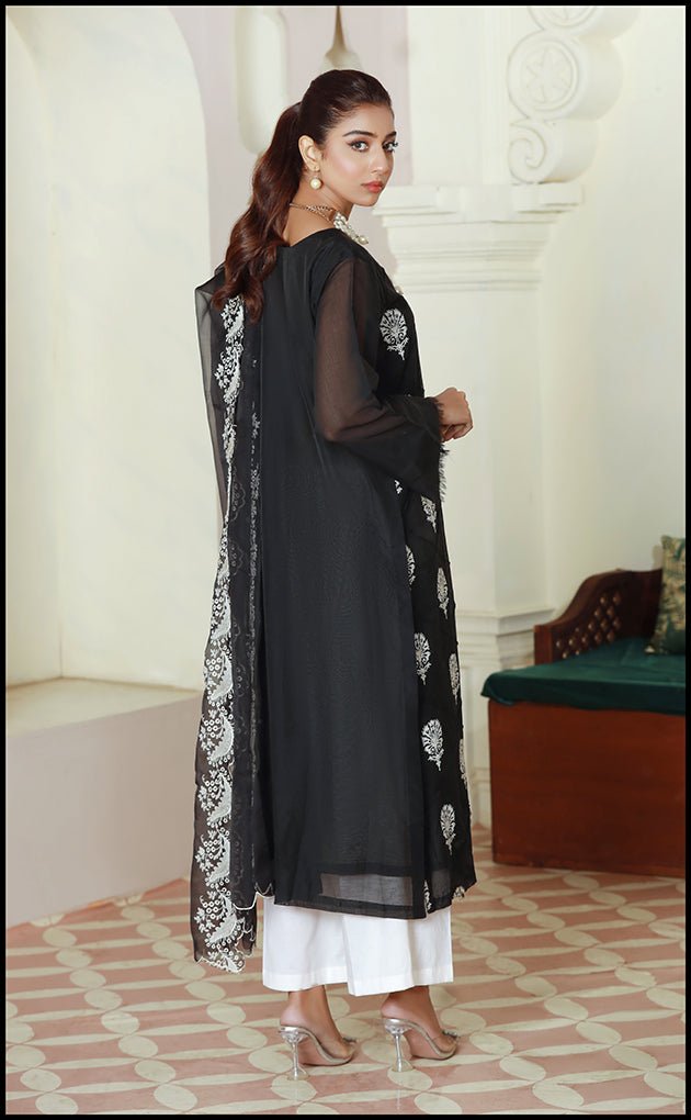 - Black defines the purity in our collection where it is defined with a very sleek cross stitch emberoidery on the surface with pleates to define the cultural heritage in a form of textiles. It is paired with a chickenkari embroidery bordered dupatta and an off-white emberoidery trouser on cotton