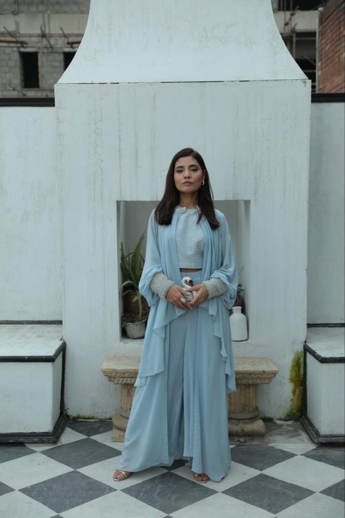 Ice blue indulge with the softness of chic drapped fabric chiffon where it is embelished with crystal butterflies on the neck part. Sleeves are heavily enhanced with sworsaki and crytal pipers to give its a elegant look where it is paired with pleated pants to give it a perfect combination for the spring