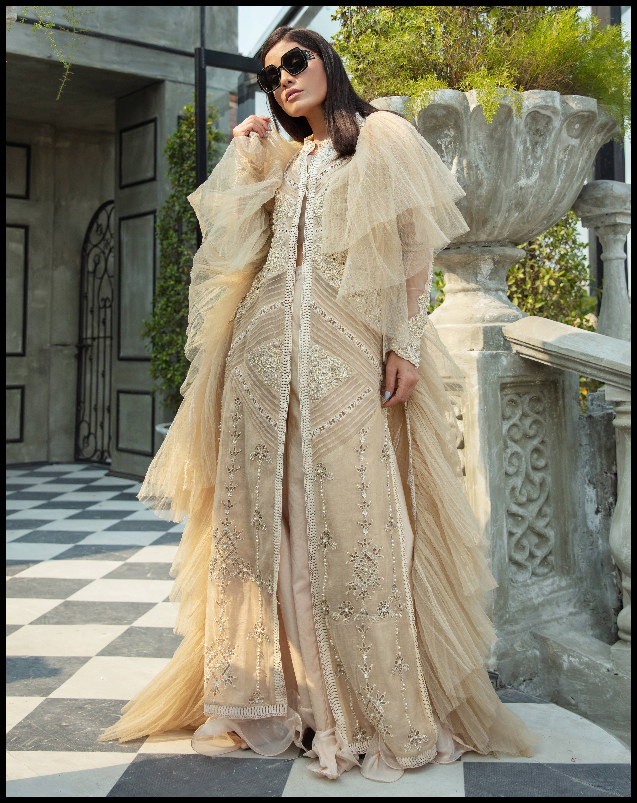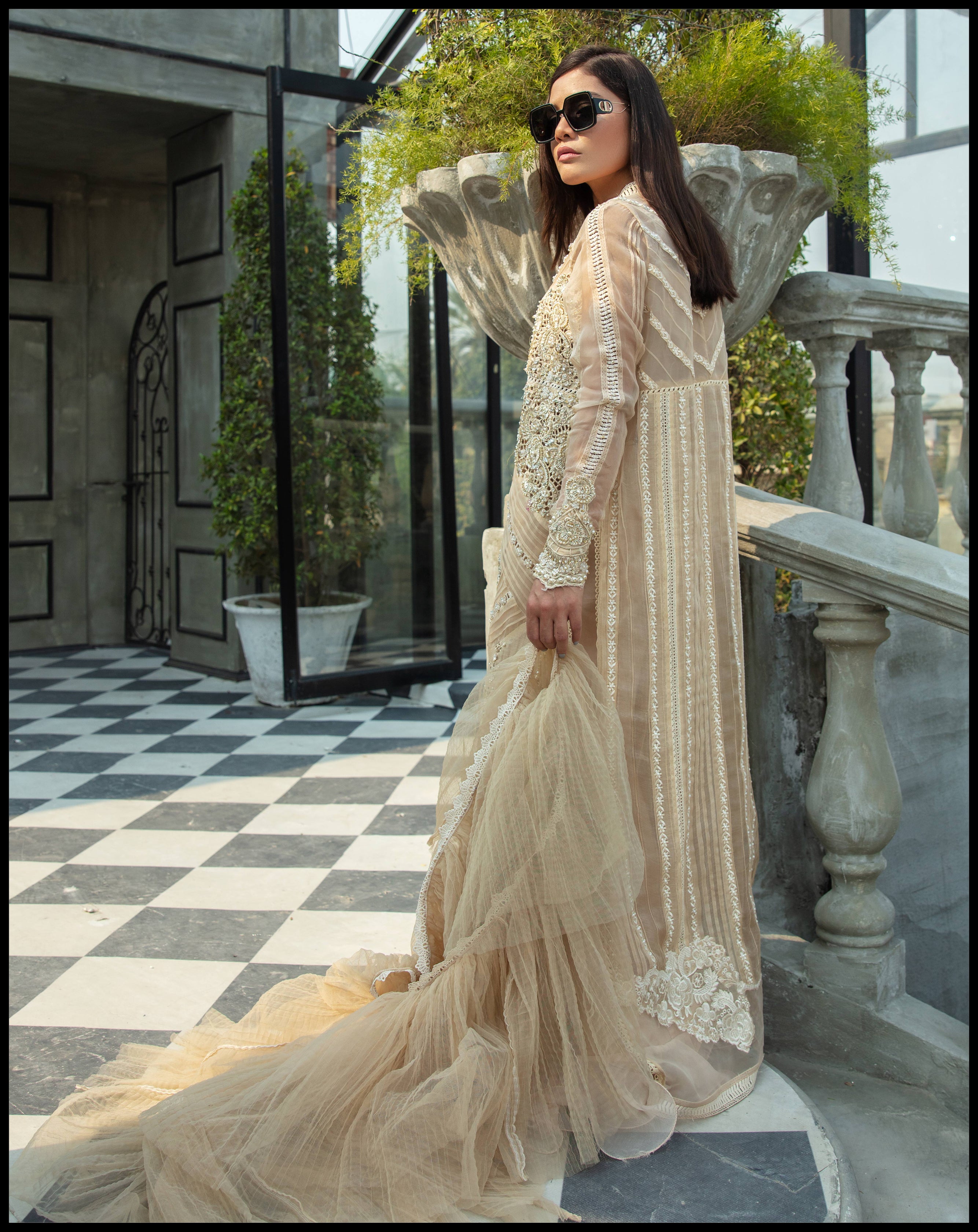 Cotton net combined with organza pleats to form a lavish look for your wardrobe. Paired with a frill net veil and pure raw silk pants, an effortlessly elegant piece for your festivities.