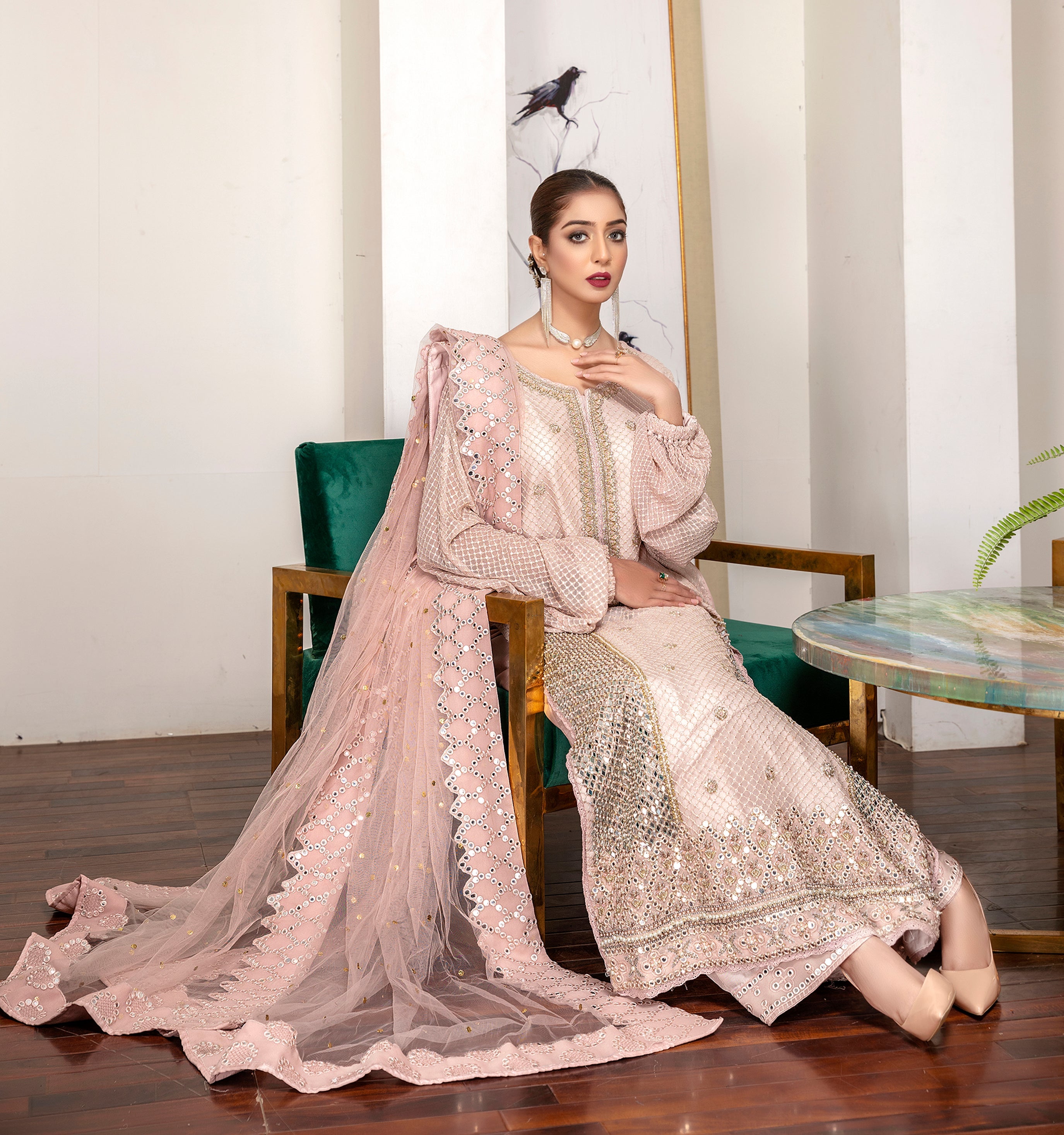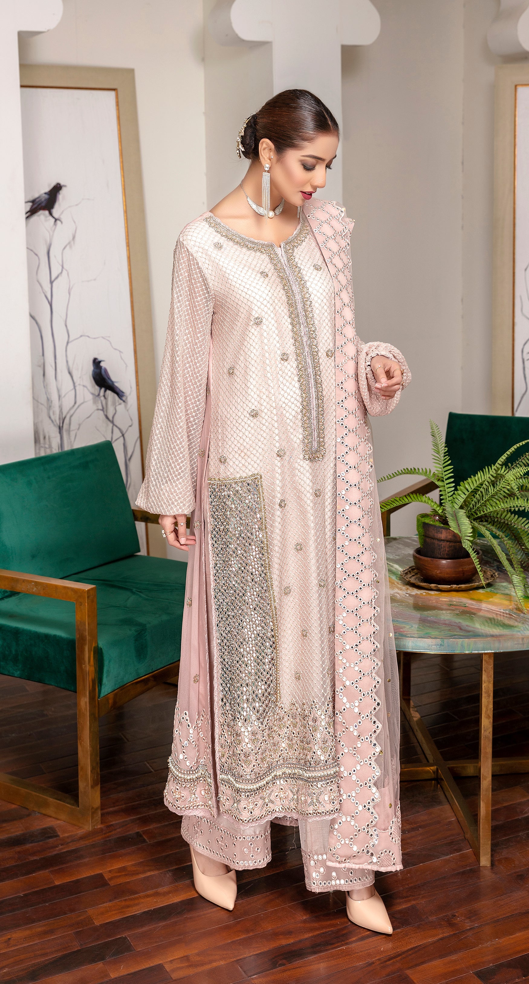 Lilac chicken kari shirt embelished with traditional culture. Where dabka and naqshi is used to define the mirror work on the the beauitful self embedded fabric, paired with heavy dupatta and azaar pants with mirror border on the bottom