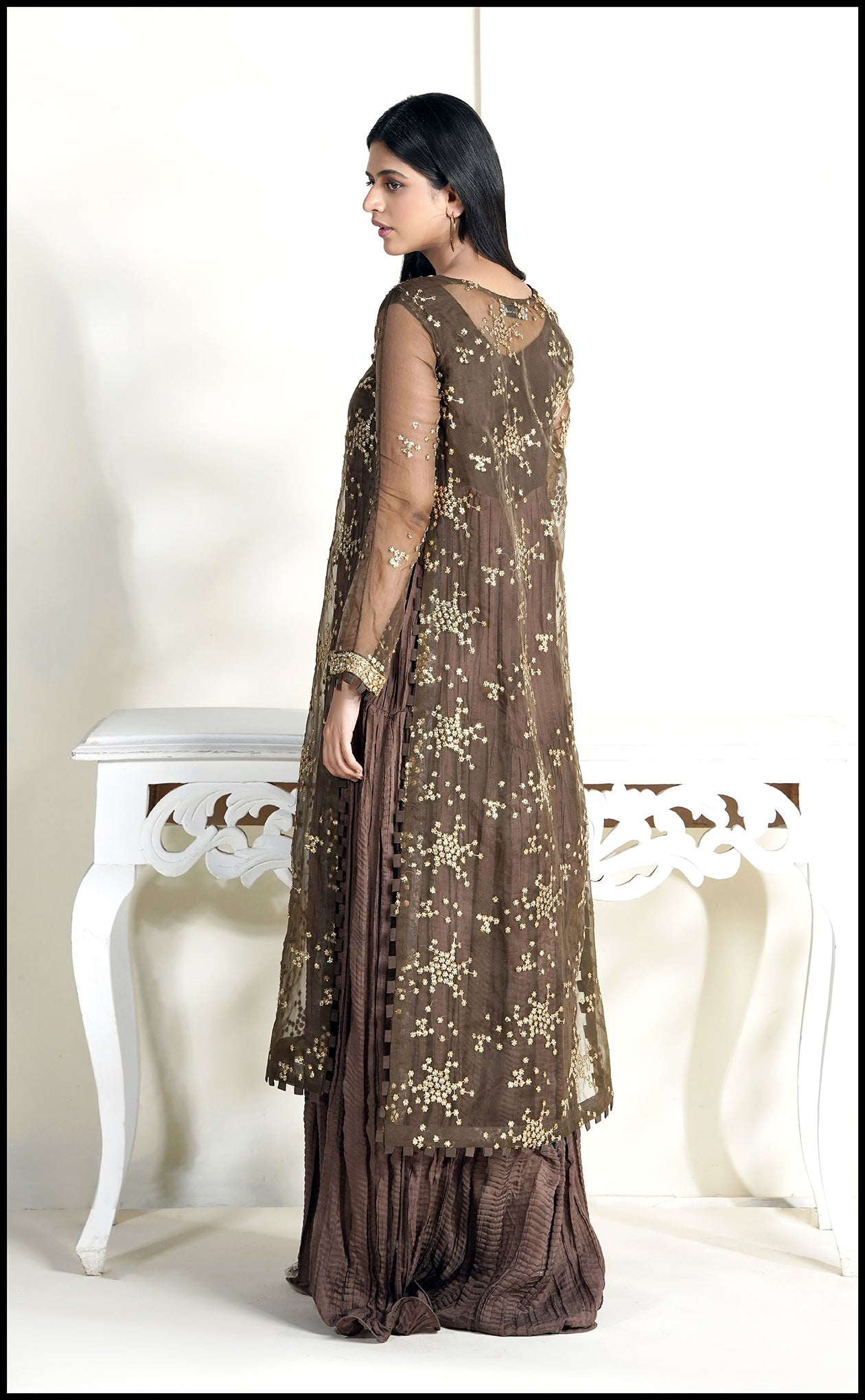- This contemporary silhouette features intricate handwork details on the neckline and sleeves with an interplay of geometric patters accented with sequins elements. It comes with a swirly crush lehenga that gives it a modern yet feminine touch.
