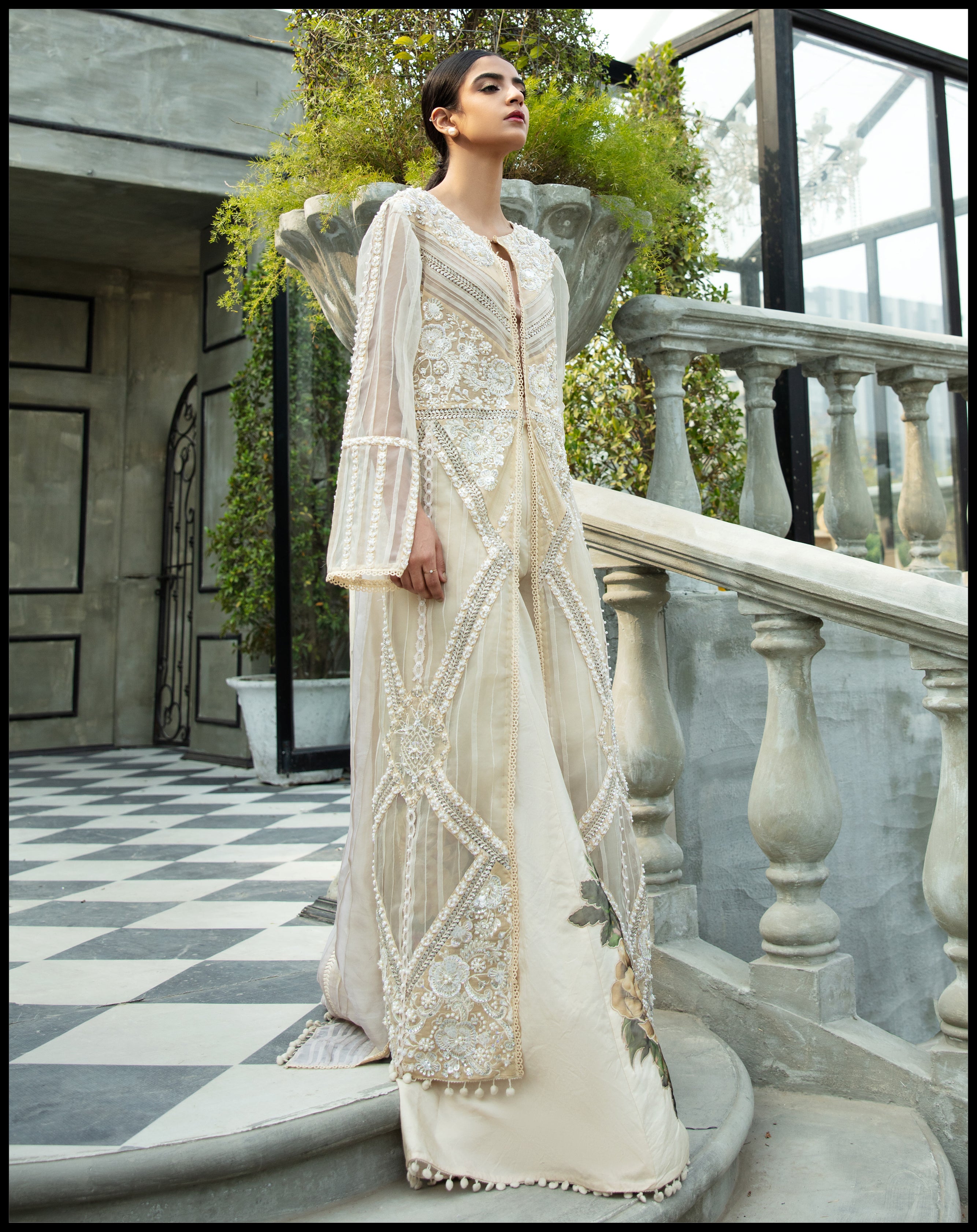 Heavy motifs are further embelished with special techniques on this organza piece; paired with beautifully digital printed pants making you steal the show effortlessly.