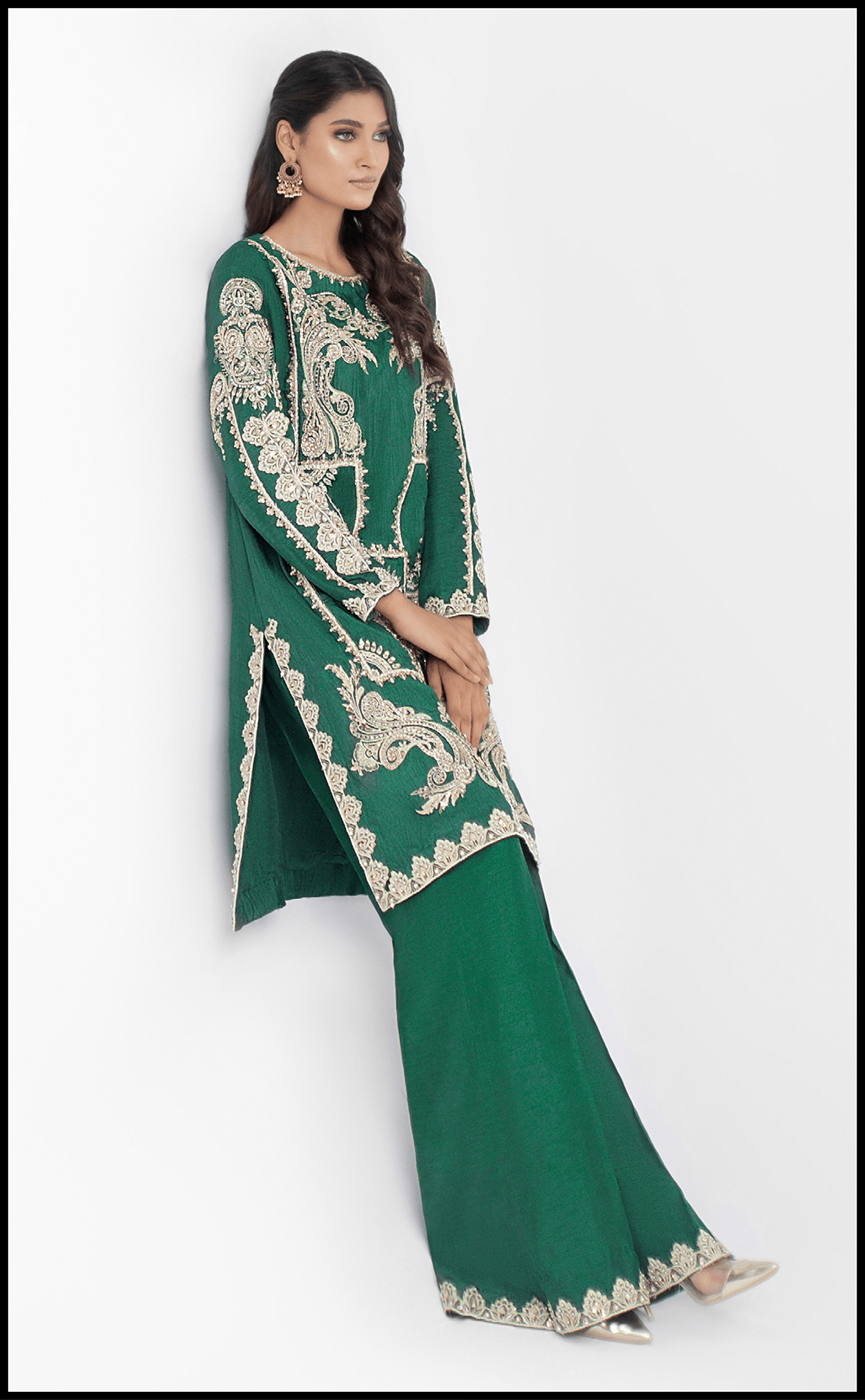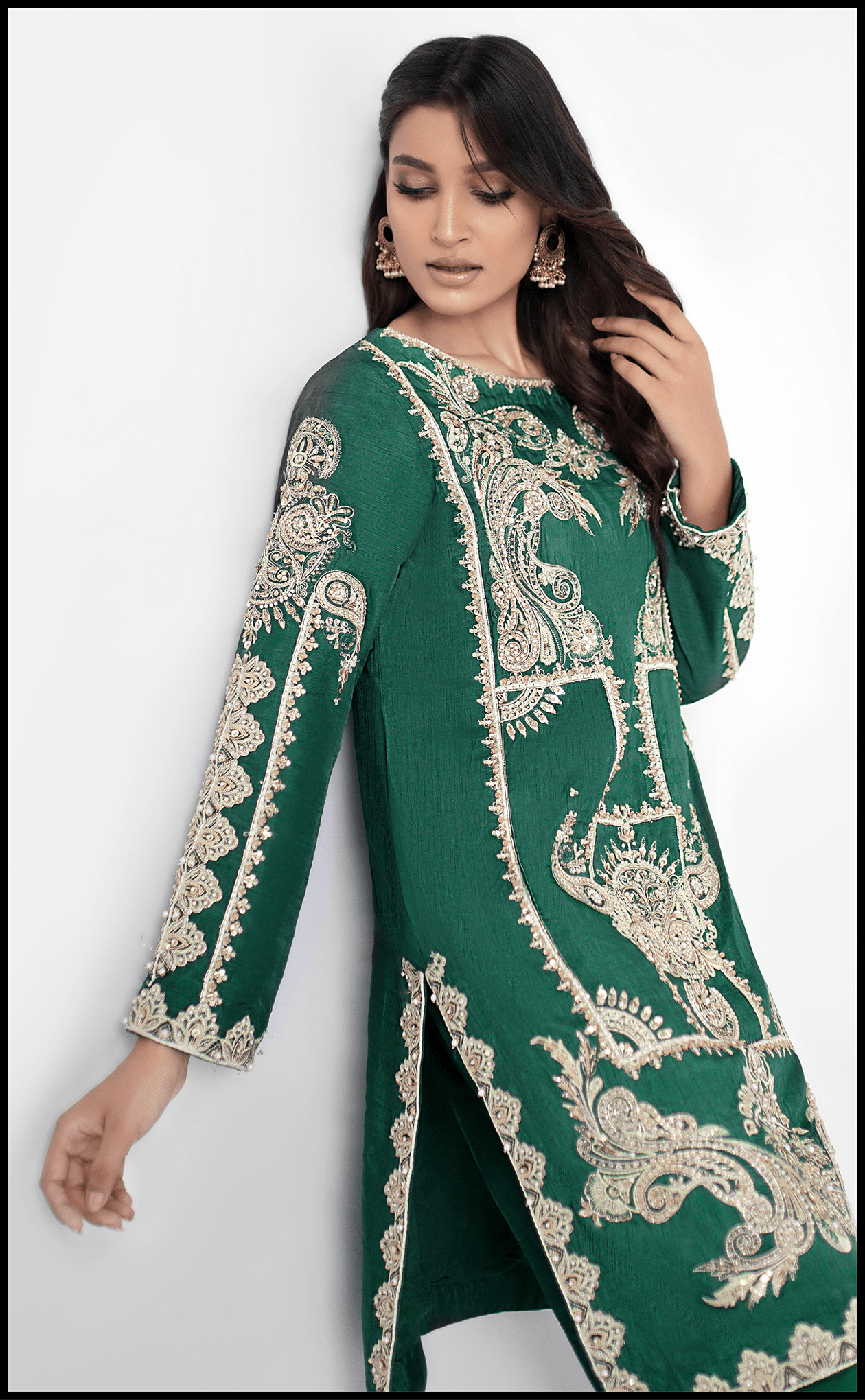 Pure raw silk bottle green kurta with finely embroidered with hand embellishment, finished with exquisite zardozi work on shirt with pair of silk boot cut pant n embroidered dupatta