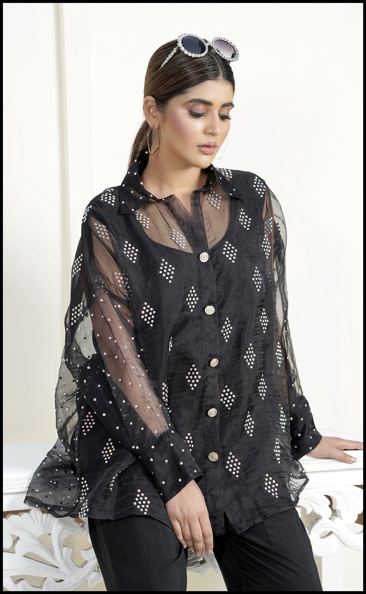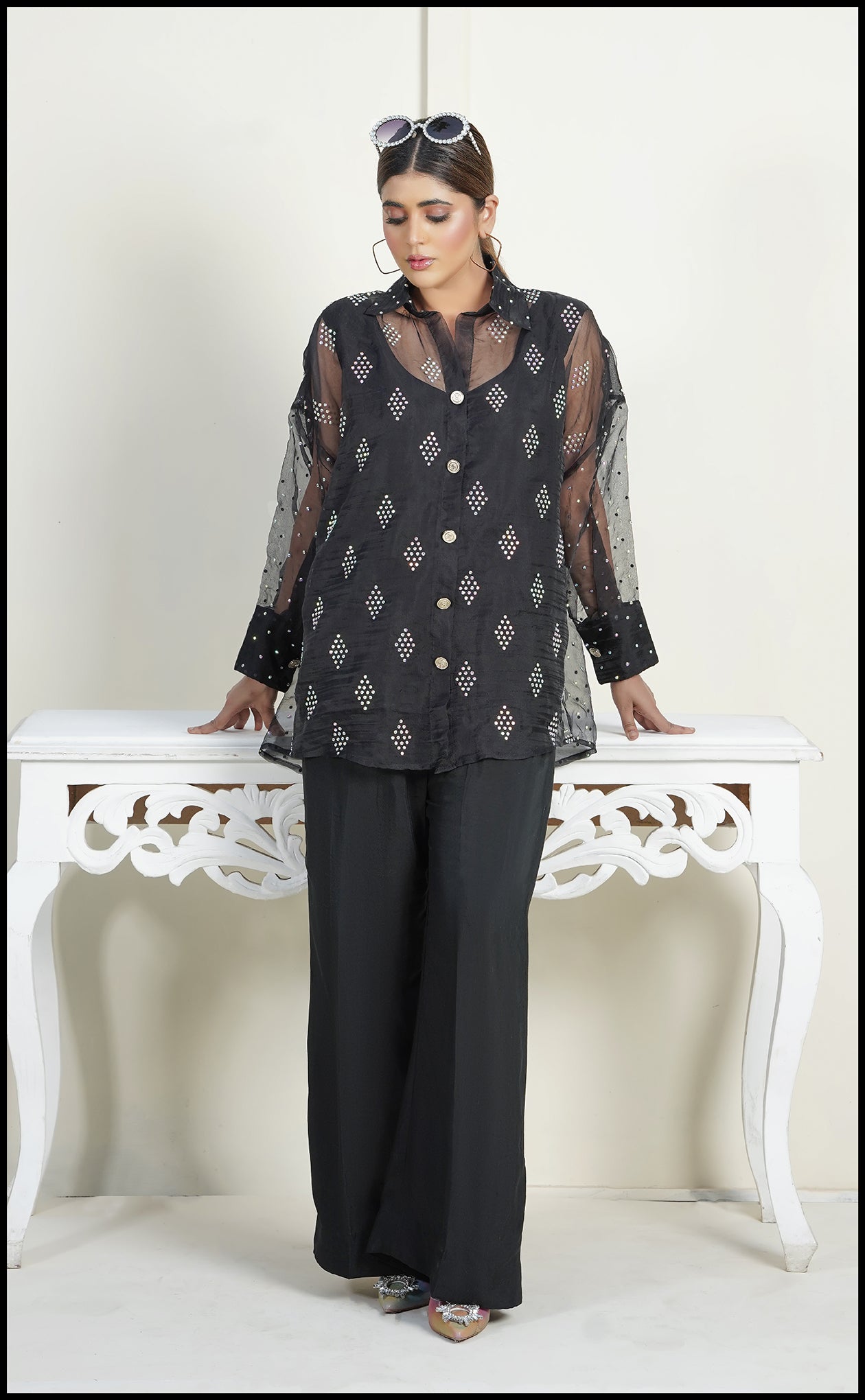 - “Nysa”- this organza top accentuates artistic Swarovski patterns that melds modernity and charm in mystical way. This silhouette comes with PK raw silk slip and boot cut pants.
