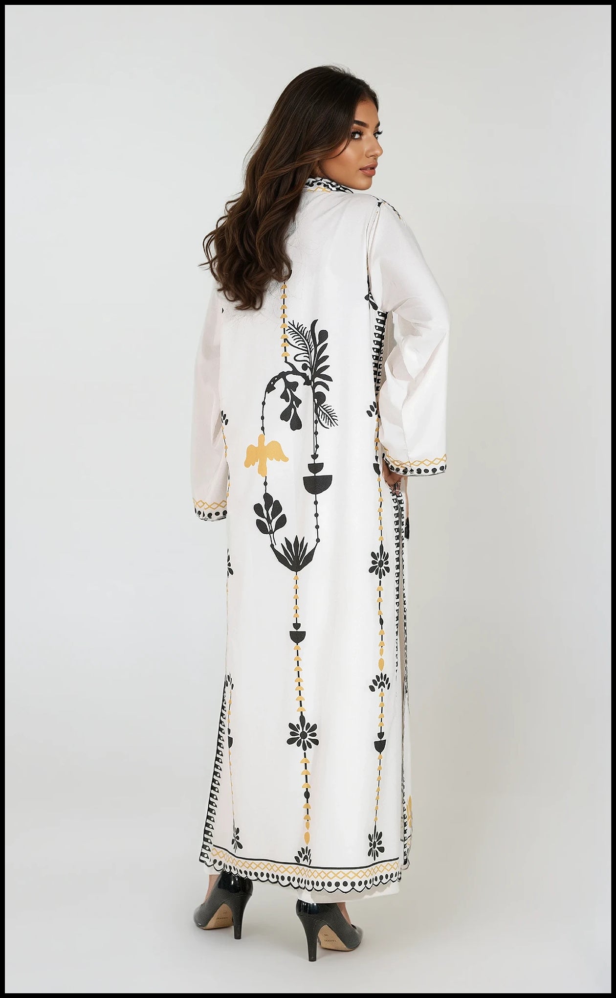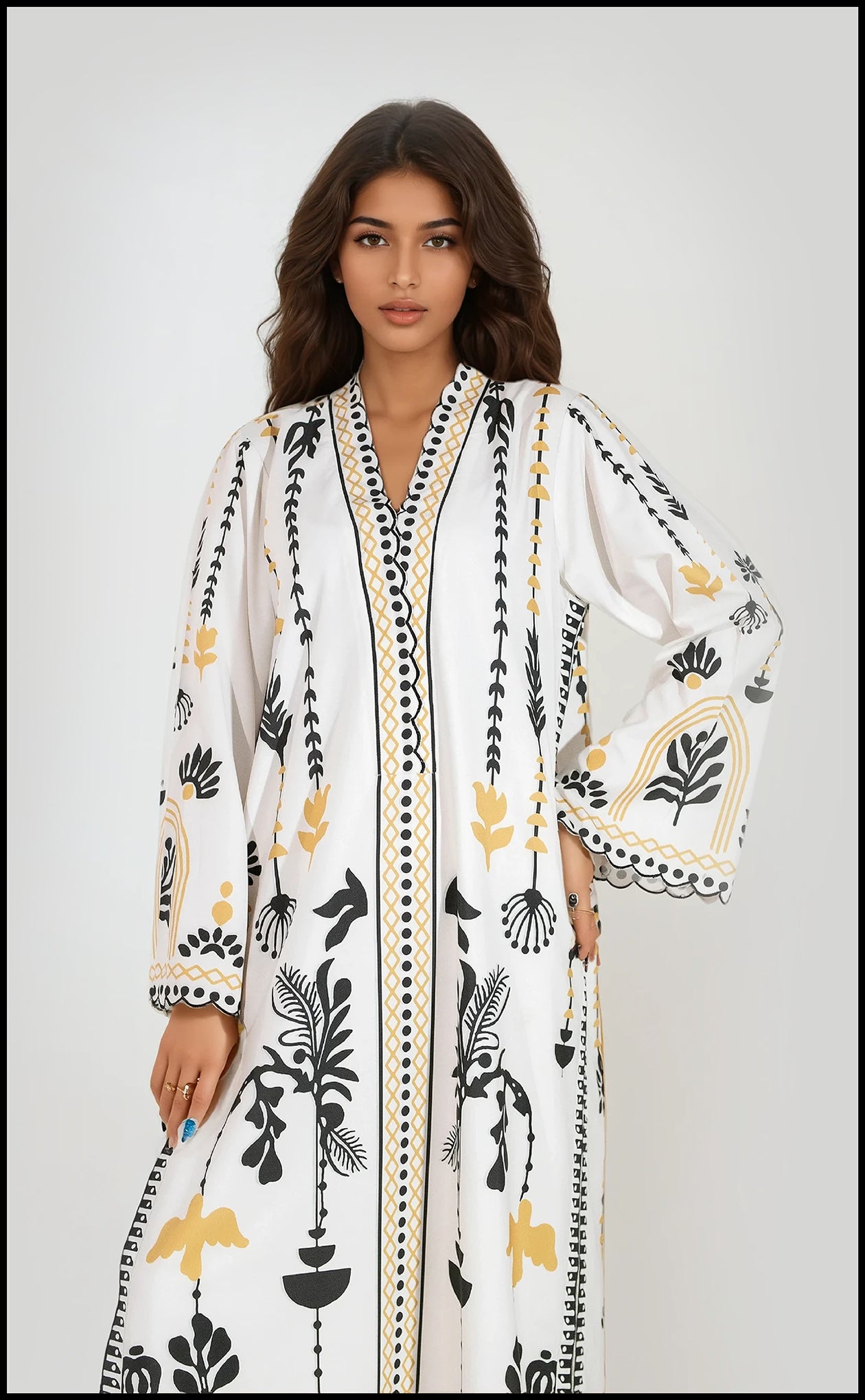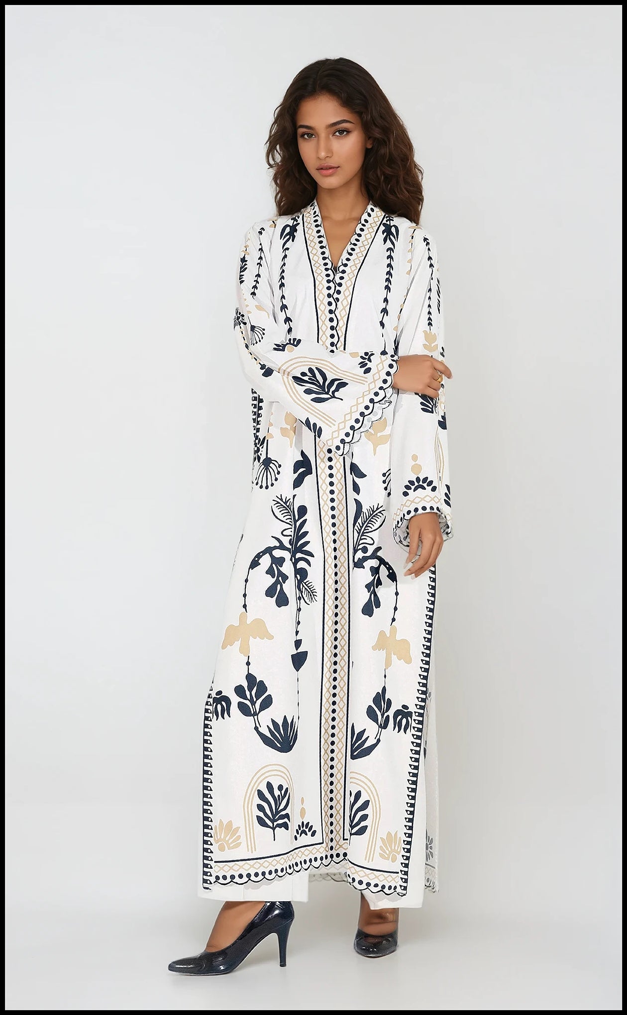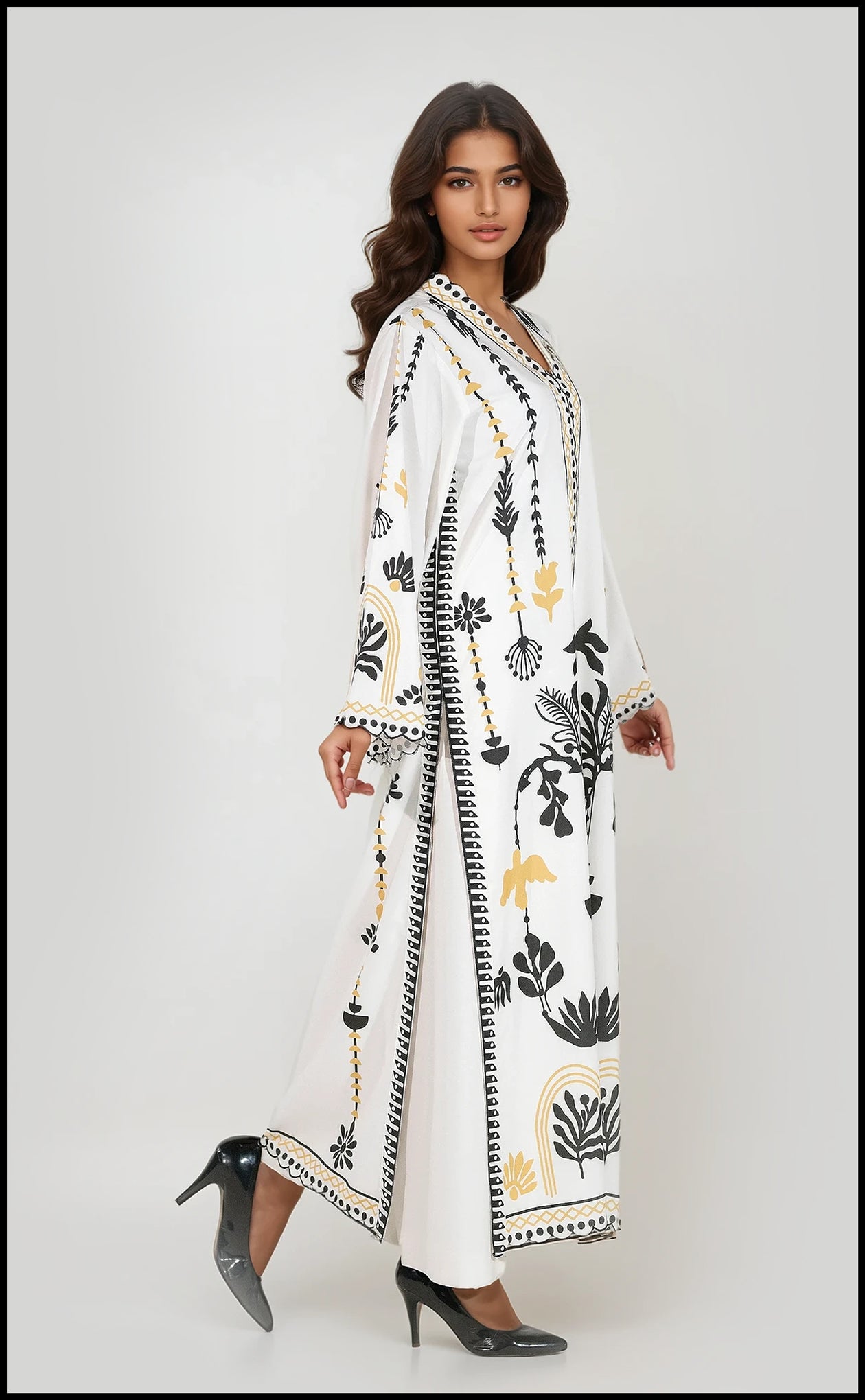 Embrace the drama of the Obsidian Bloom. This luxurious winter slub set boasts a vibrant botanical print in rich black, crisp white, and warm gold accents. The unique V-neckline and full-length border create a stunning, elongated silhouette. The design is perfected with delicate scalloped edges finishing the cuffs and hemline, adding a final layer of texture and decorative refinement to this contemporary and timeless outfit.