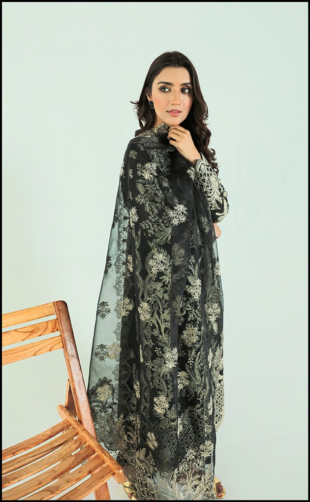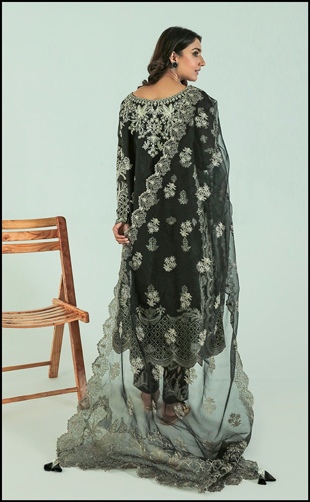 • Black is always an essential part of our summer wardrobe where we introduce to our chic piece heavily embroidered on our self-rendered cotton fabric dyes in the hues of black season. Running stitch embroidery with a sleek look to the shirt and its draped in an A line shirt. It is paired with a heavy composed dupatta having a scalped border all four sided. It is complete with a very hand manipulated trouser giving a very sleek look to the trouser.