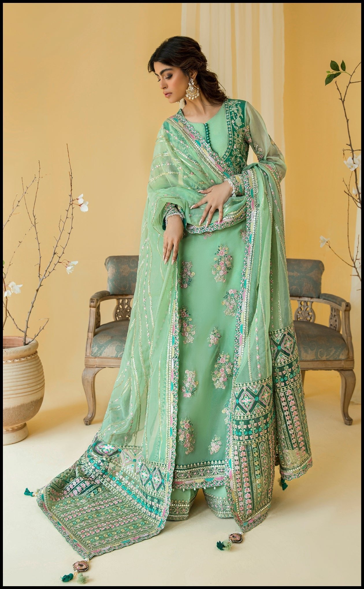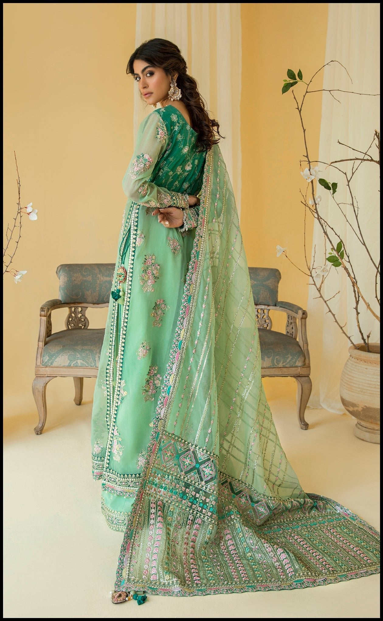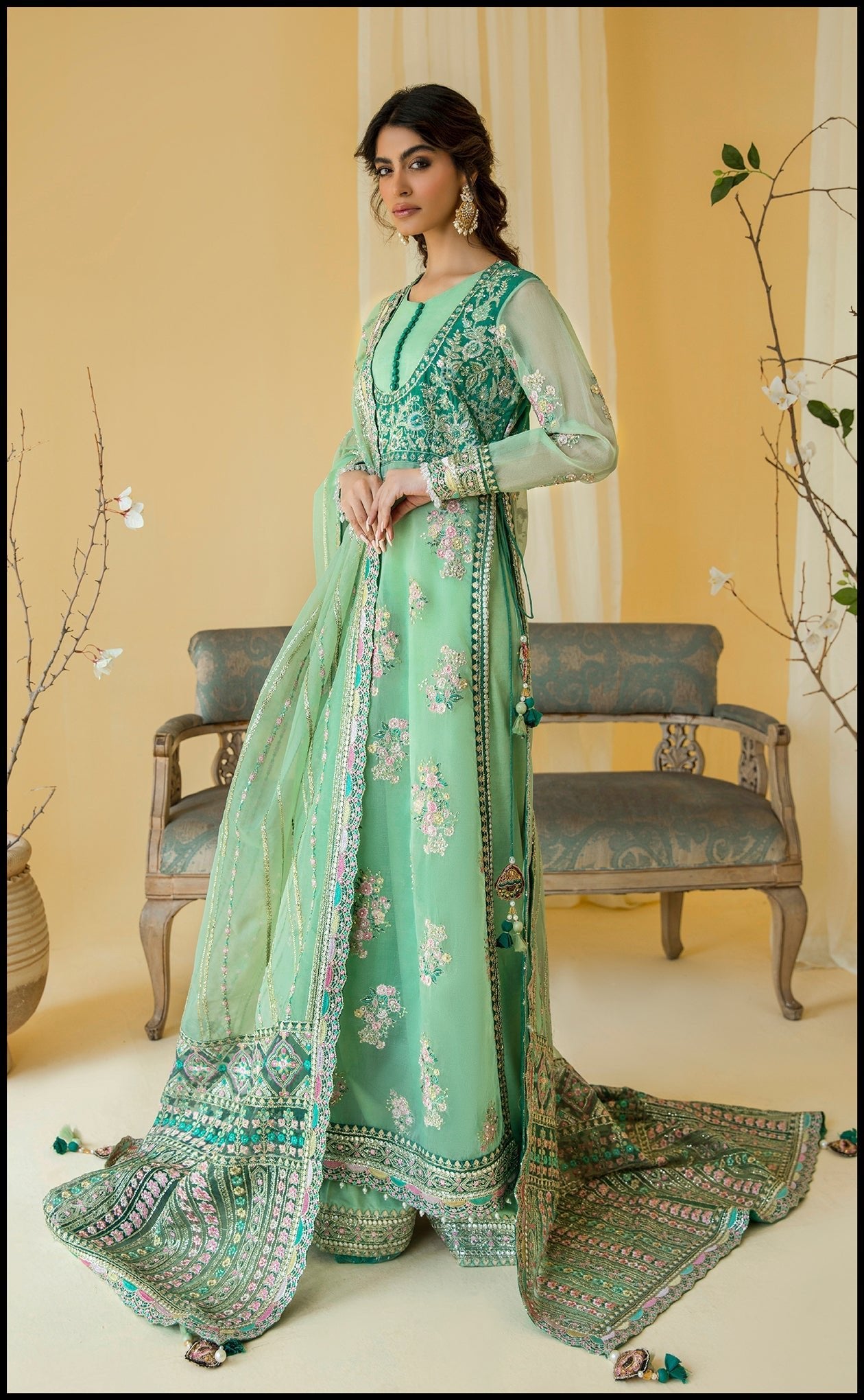Introducing Blume, from our newest collection, featuring a stunning festive shirt. Crafted with the finest materials and exquisite attention to detail this outfit is the epitome of luxury. The bodice features intricate pearl work, embroidery and naqsi emblishment, while the full shirt flows effortlessly with every step, showcasing beautiful embroidery with hand emblishment on it. This shirt is paired with a embroided dupatta with contrants embroided panels, adding a touch of grace and sophistication to the overall look. Perfect for any special occasion, this outfit is sure to turn heads and leave a lasting impression.