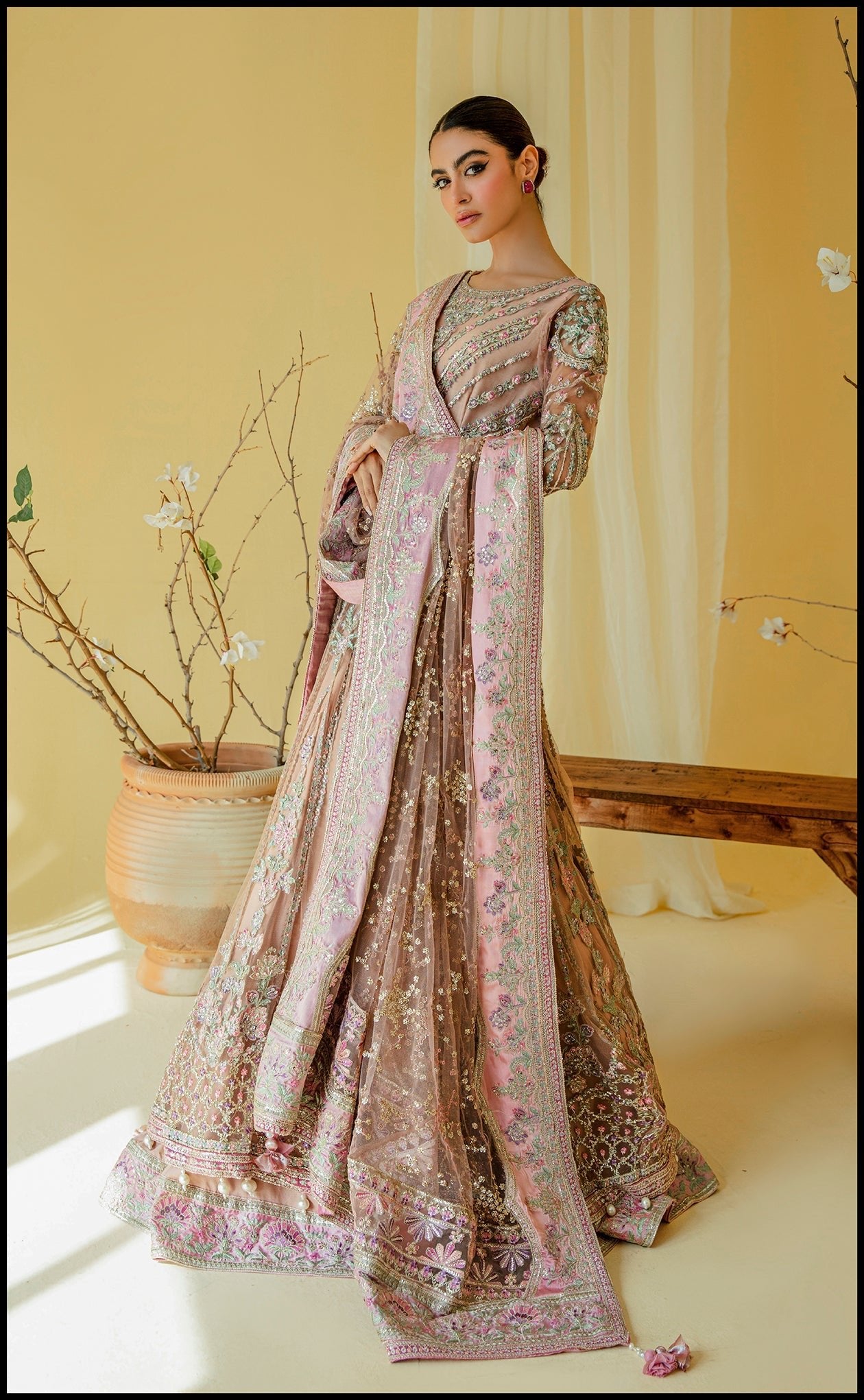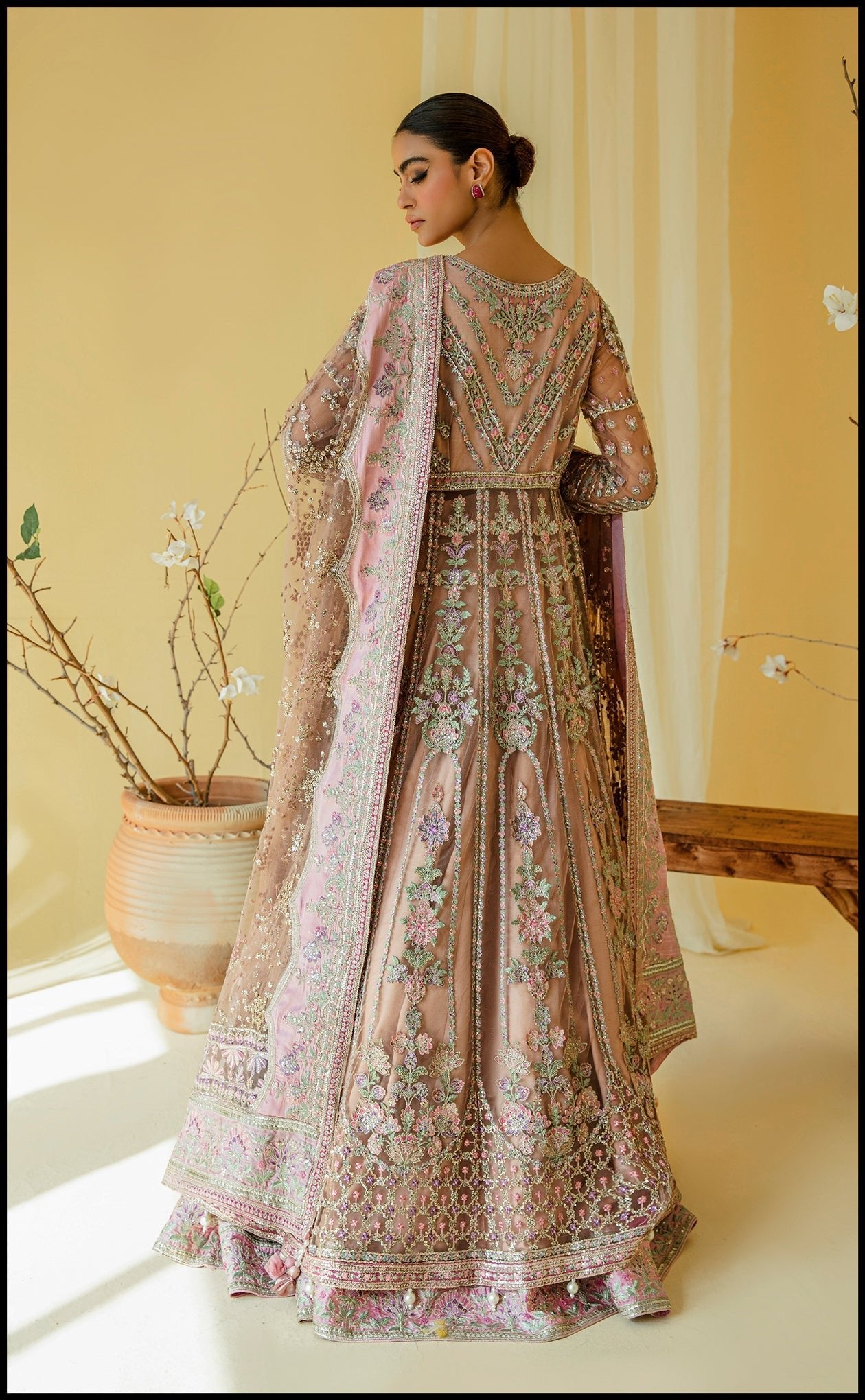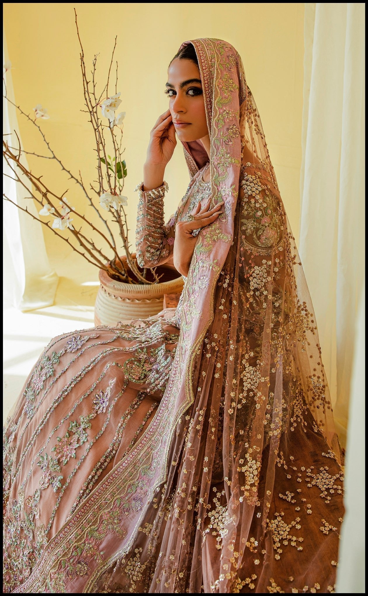 Presenting the perfect contemporary formal attire to make a statement on a special day. Its dusty lilac pashwas, heavily encrusted net fabric with meticulous embroidery and handwork strike a heavenly and graceful feel. An exceptional part from Rumli formal collection, embellished with threads sequin that create a sense of chasm and texture, to the naqshi embroidery that adds glamour and refinement, every detail has been crafted carefully to create a one-of-a-kind piece.