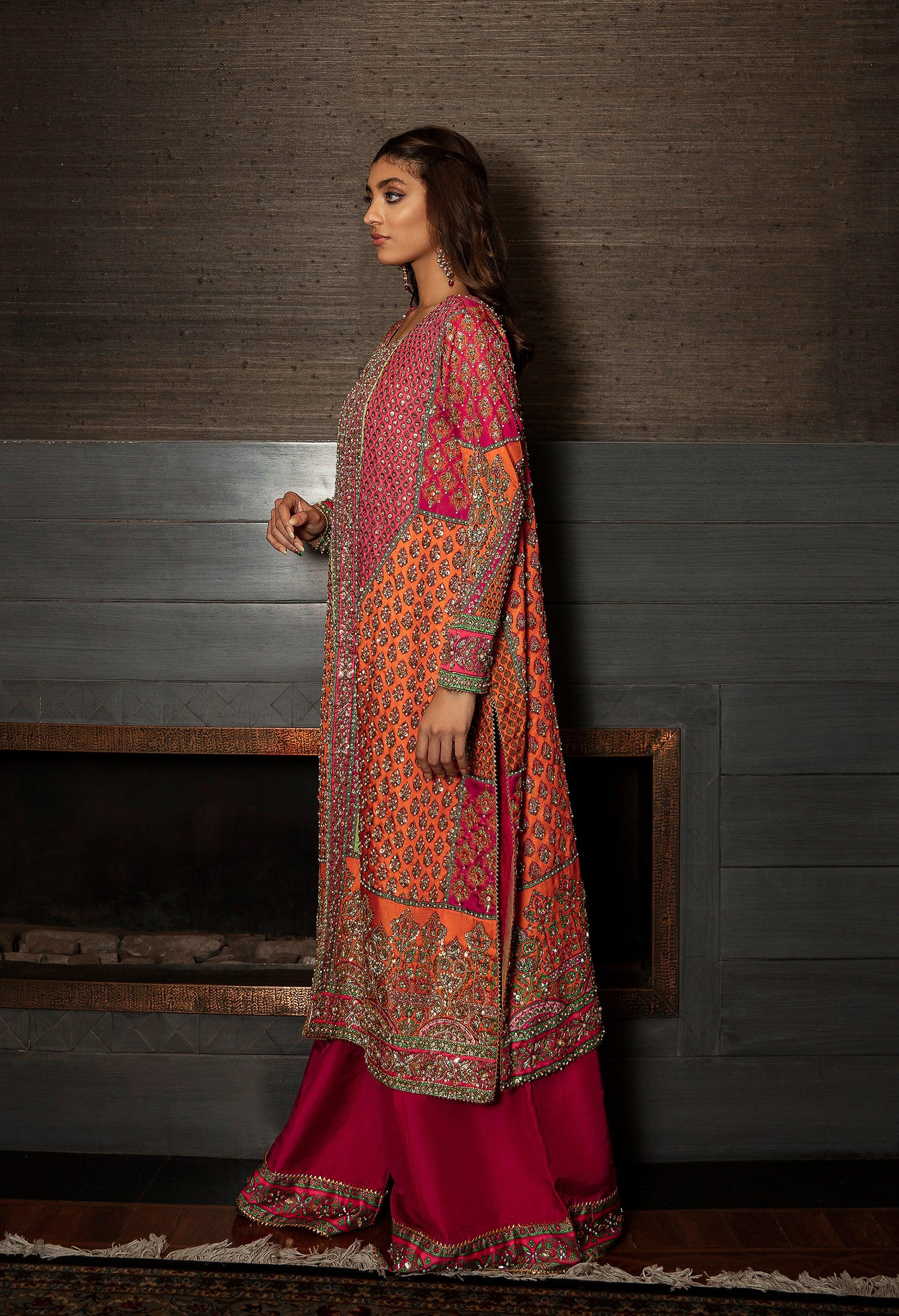 Heavy embelishement done defining the dabka and nqshi overlayed with gotga work with crush silk layered gharara to you a perfect festive ensemble