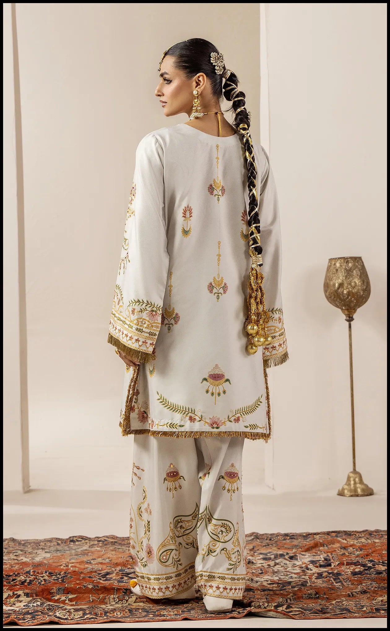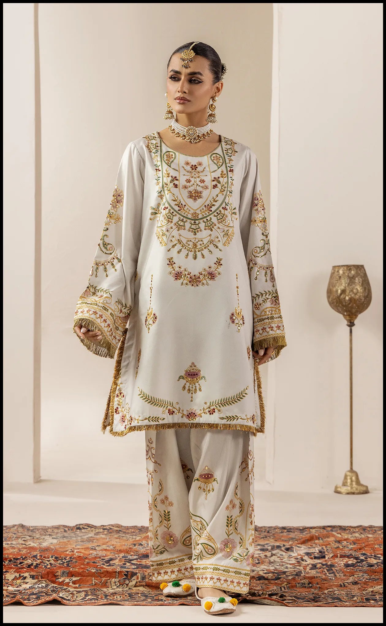 Crafted in luxurious raw silk, this elegant 3-piece outfit showcases intricate print and delicate embellishments on the shirt, paired with a matching trouser and a coordinating dupatta. Saher e Noor is perfect for festive celebrations and special occasions, offering a radiant and timelessly graceful look.