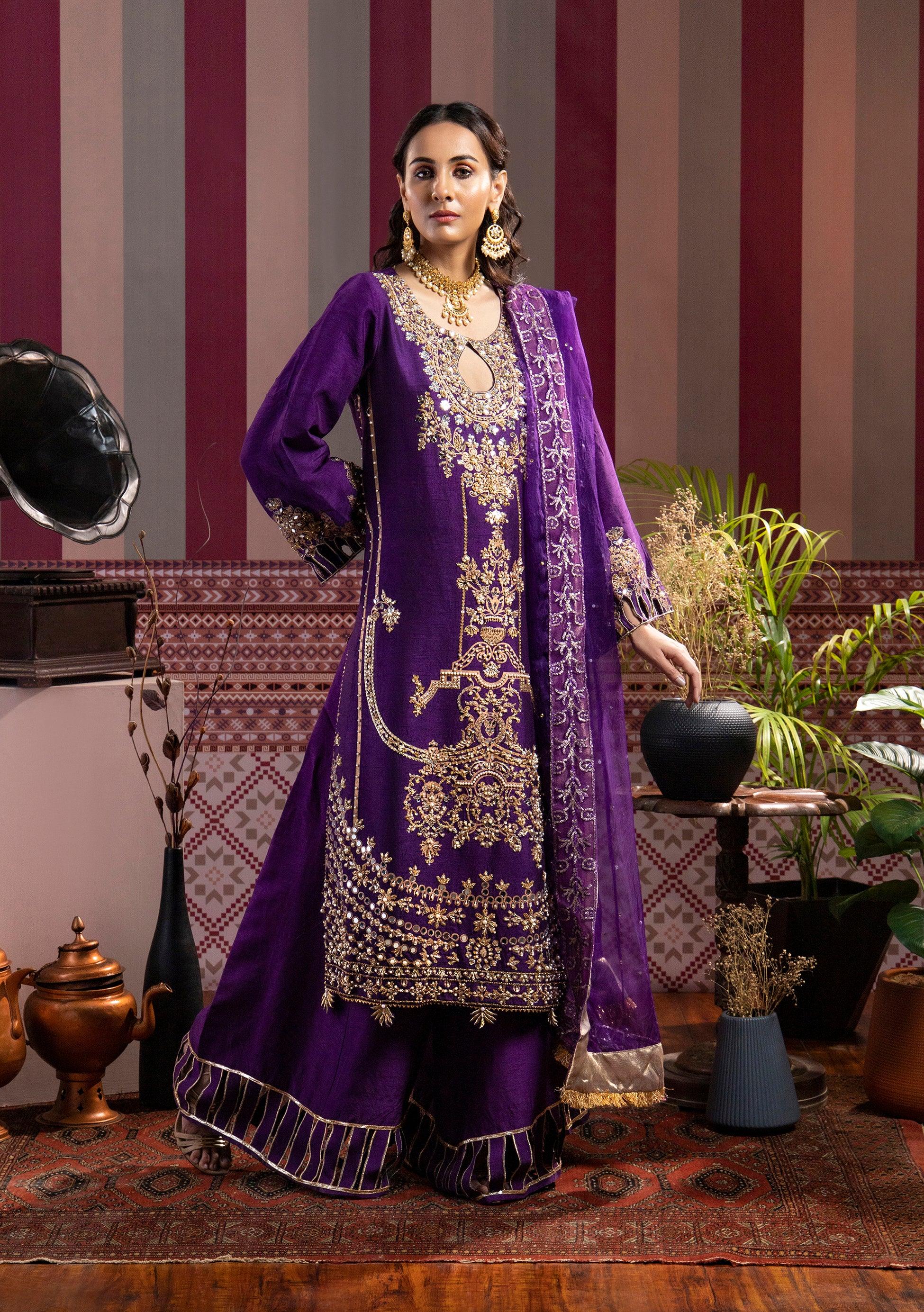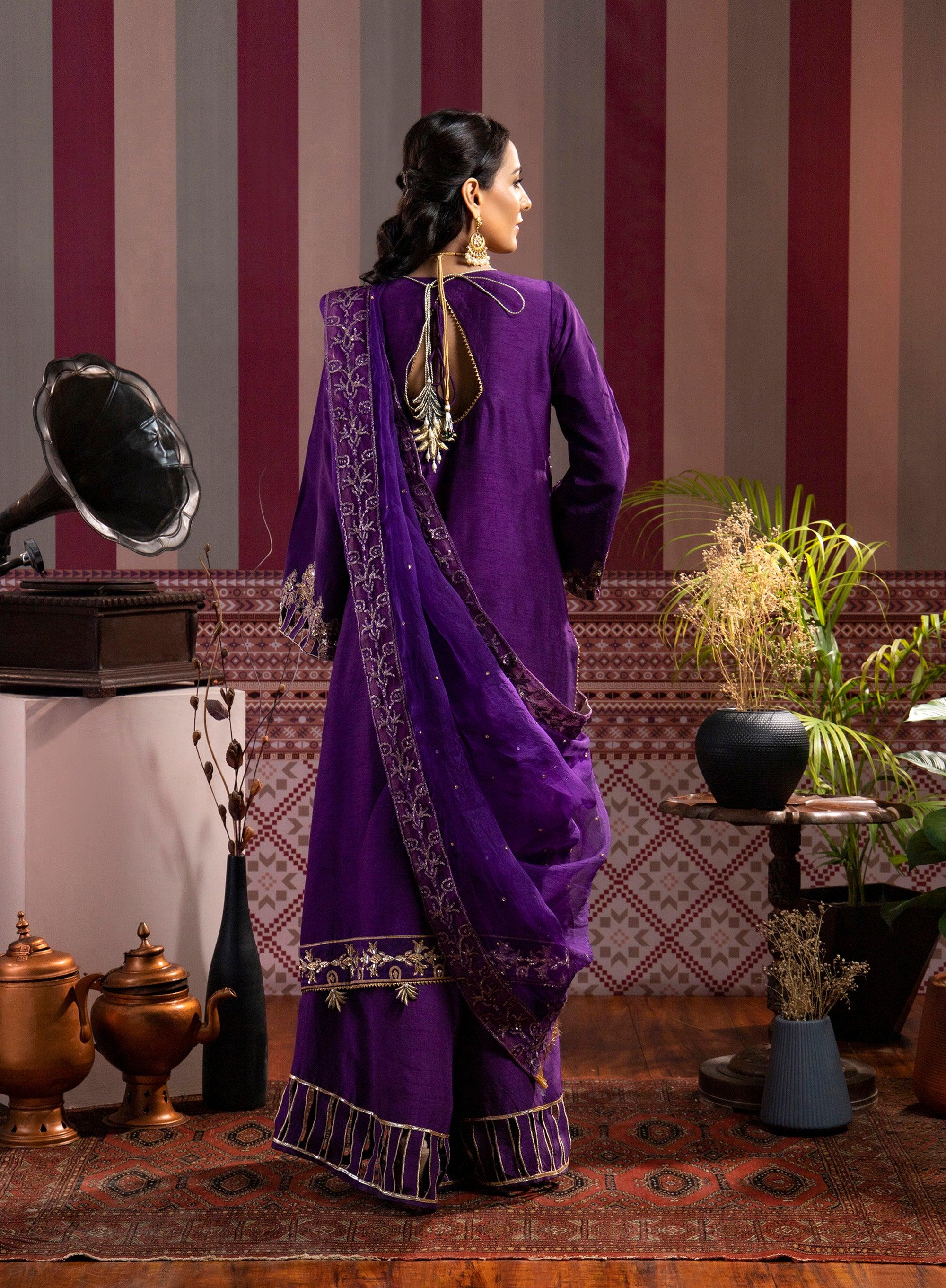 Raw silk fused with contrasted gold delicate work giving hues of plum color.