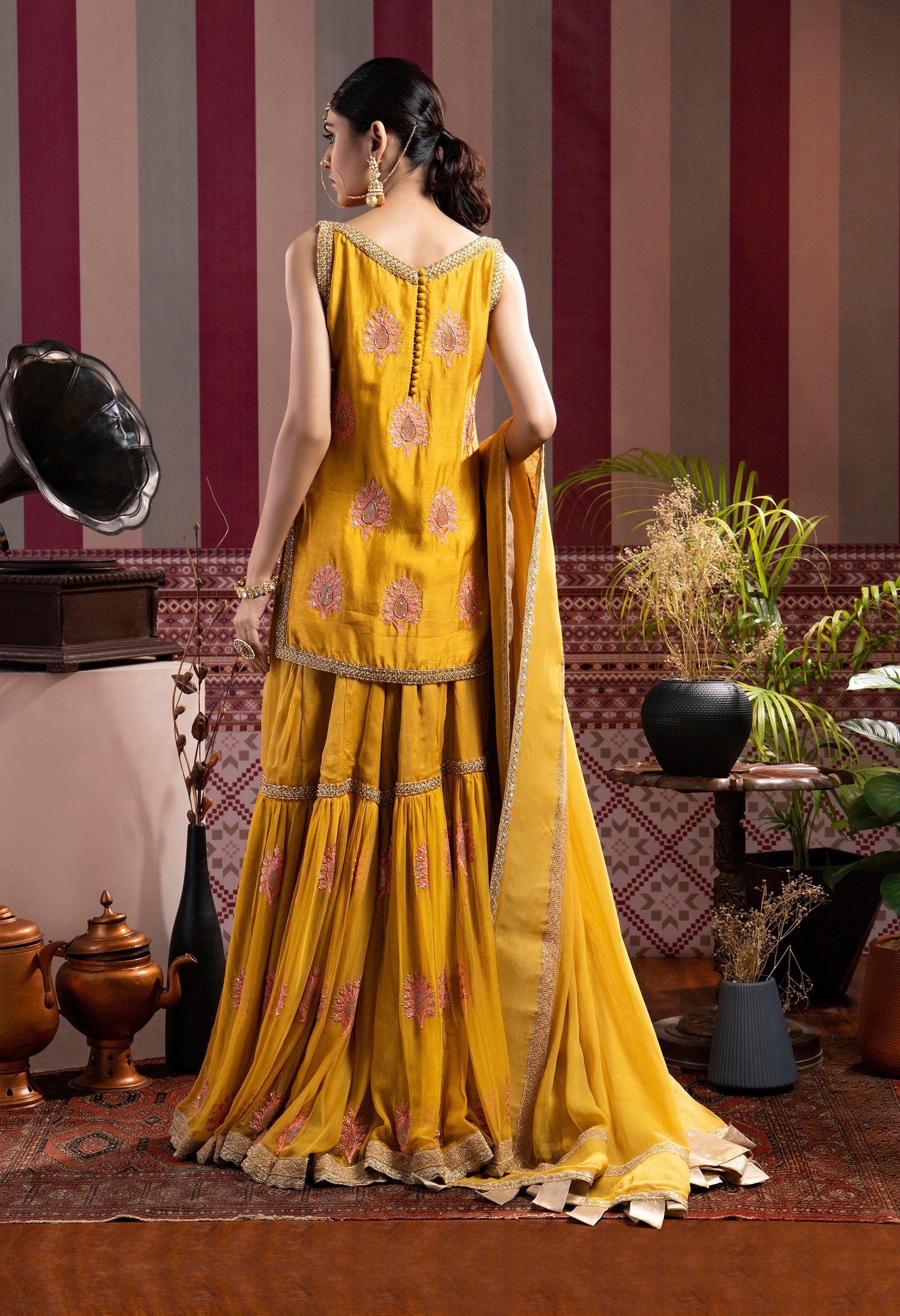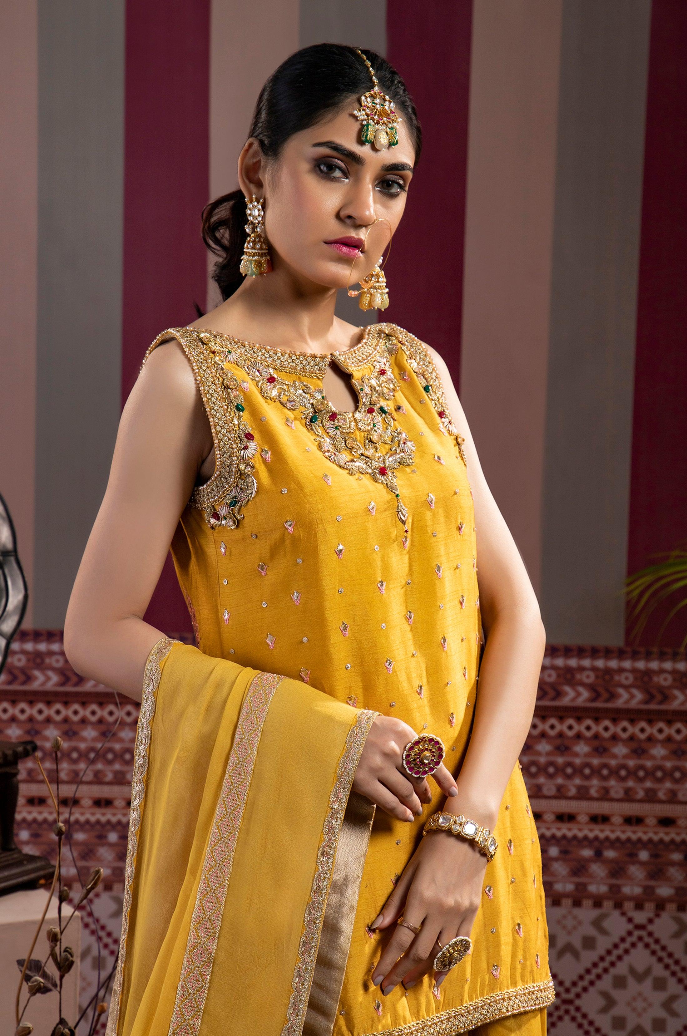This traditional pieace describes the old heritage of the century where dabka and stone work are combined together to form a perfect pieace for your wardrobe