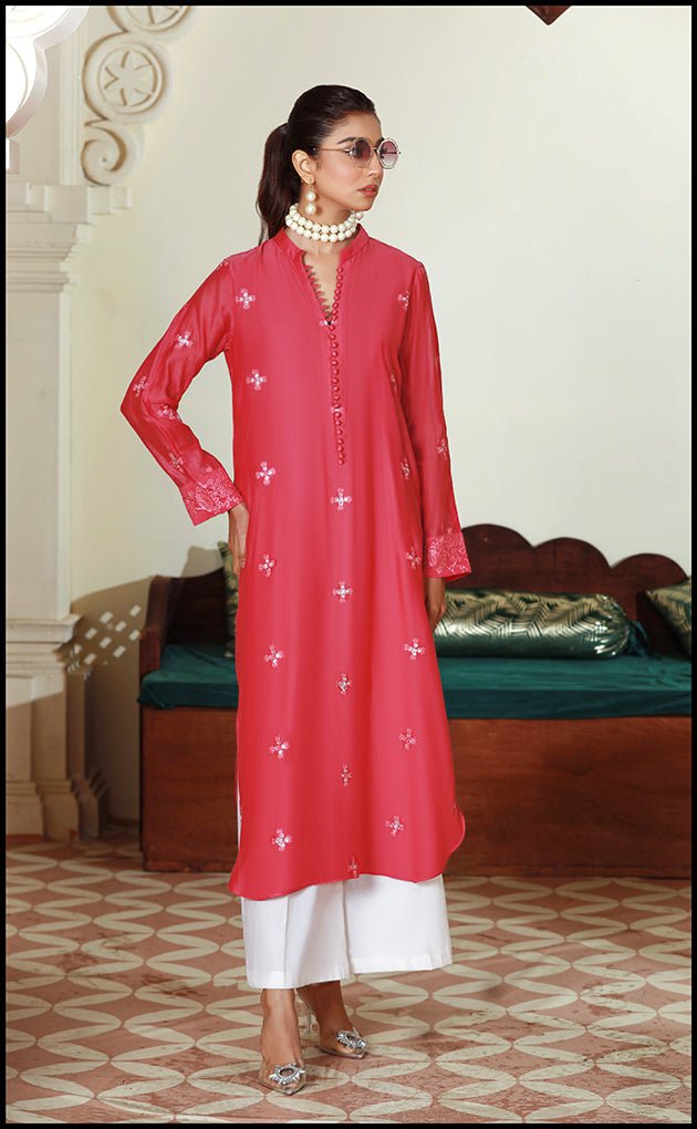 • Hot pink defines the women having a chic look in its self a very confident kurti piece embeded with mirror work paired with a chic cotton emberoided trouser